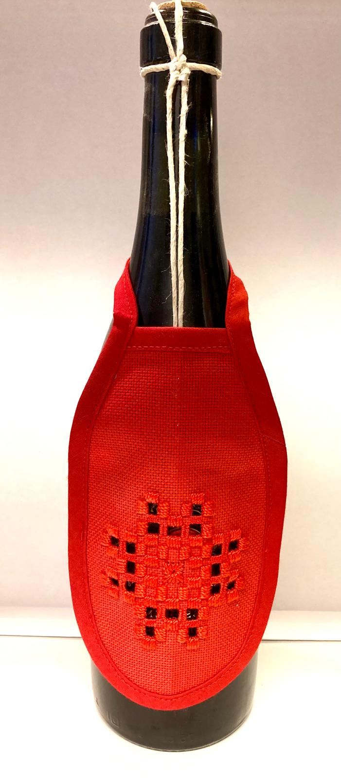 Flaskeforkle/væskestopper laget i hardangersøm. Brodert av Mamma B. NB! Potensiell bestillingsvare. Må forvente to ukers produksjonstid om det ikke finnes noen på lager.