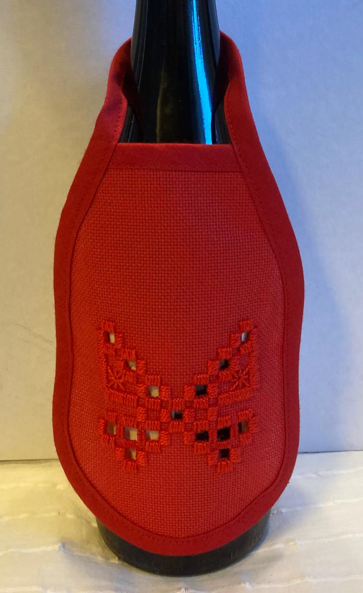Flaskeforkle/væskestopper laget i hardangersøm. Brodert av Mamma B. NB! Potensiell bestillingsvare. Må forvente to ukers produksjonstid om det ikke finnes noen på lager.