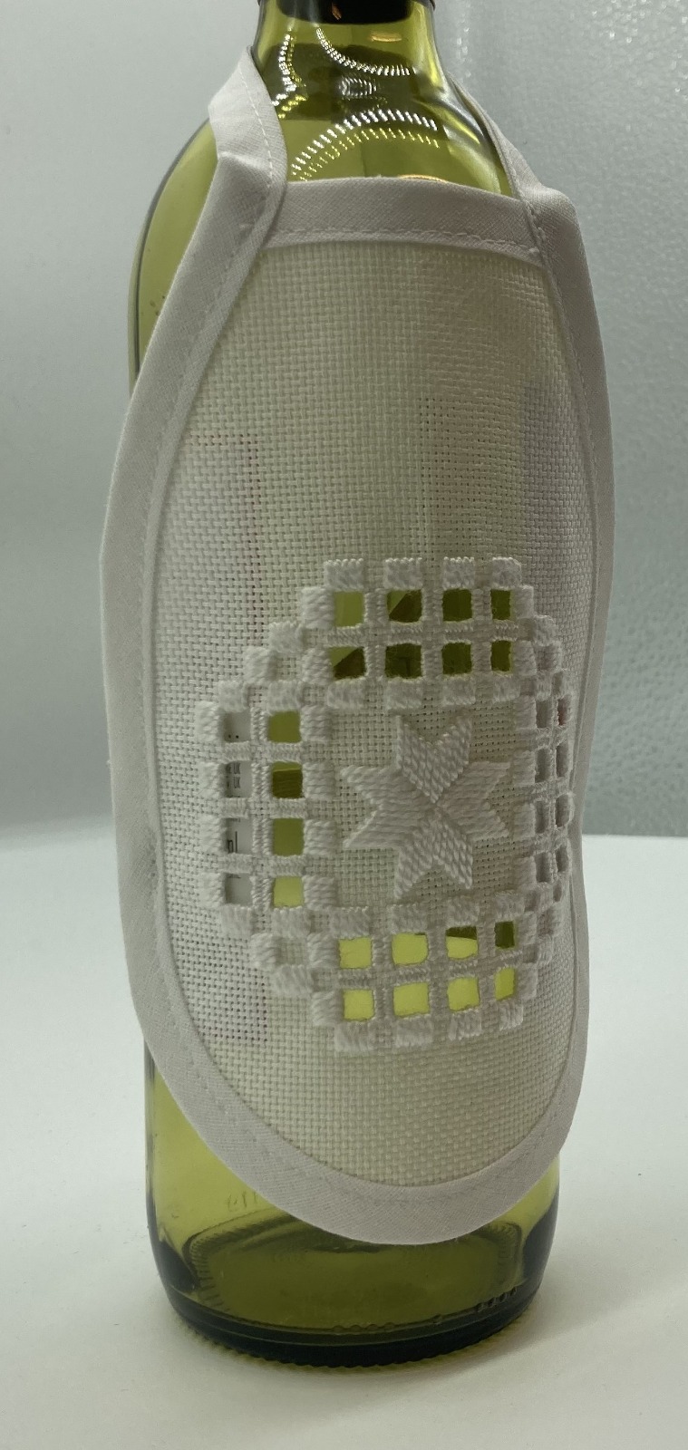 Flaskeforkle/væskestopper laget i hardangersøm. Brodert av Mamma B. NB! Potensiell bestillingsvare. Må forvente to ukers produksjonstid om det ikke finnes noen på lager.