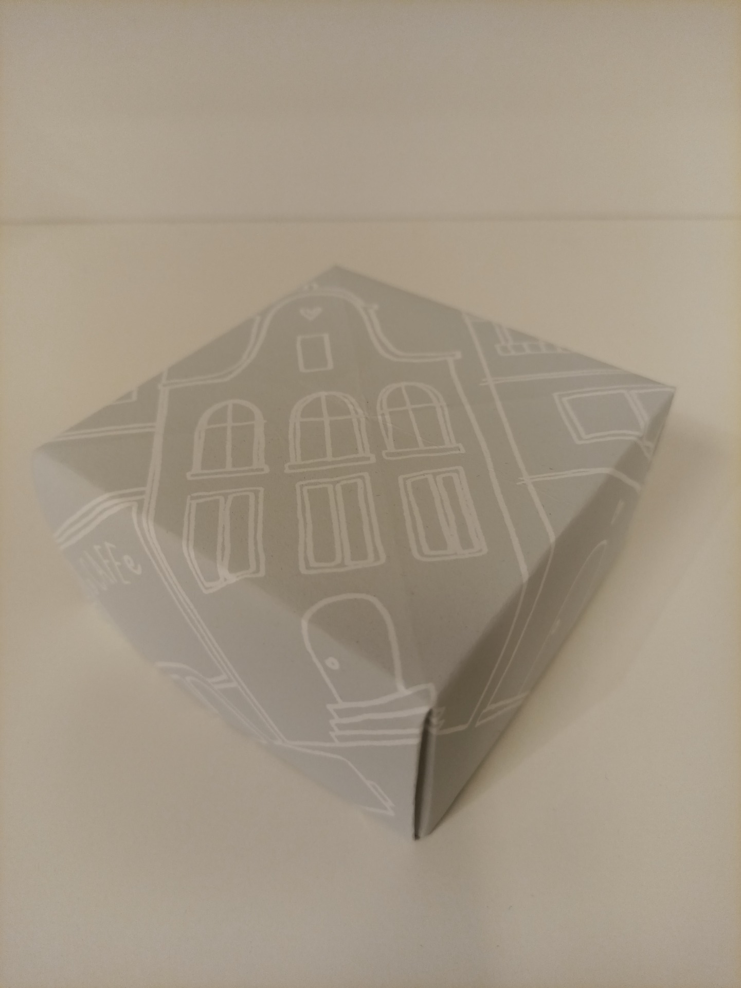 Gaveboks laget i tapetmateriale. Boksene er laget slik at str. 9 passer akkurat oppi 10, str. 8 akkurat oppi 9, og videre. Dette for å kunne spare plass ved eventuelt lagring. Denne boksen er 10x10x5 cm.