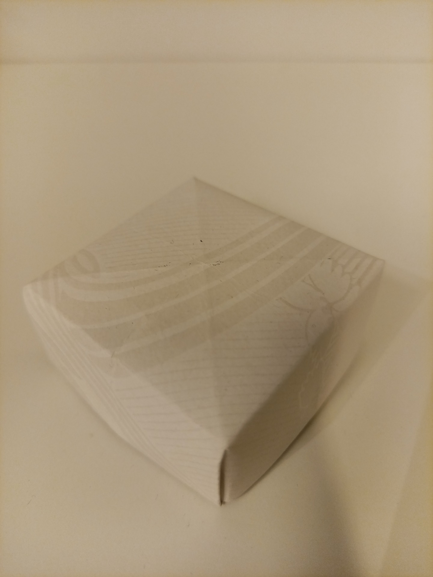 Gaveboks laget i tapetmateriale. Boksene er laget slik at str. 9 passer akkurat oppi 10, str. 8 akkurat oppi 9, og videre. Dette for å kunne spare plass ved eventuelt lagring. Denne boksen er 6x6x3 cm.