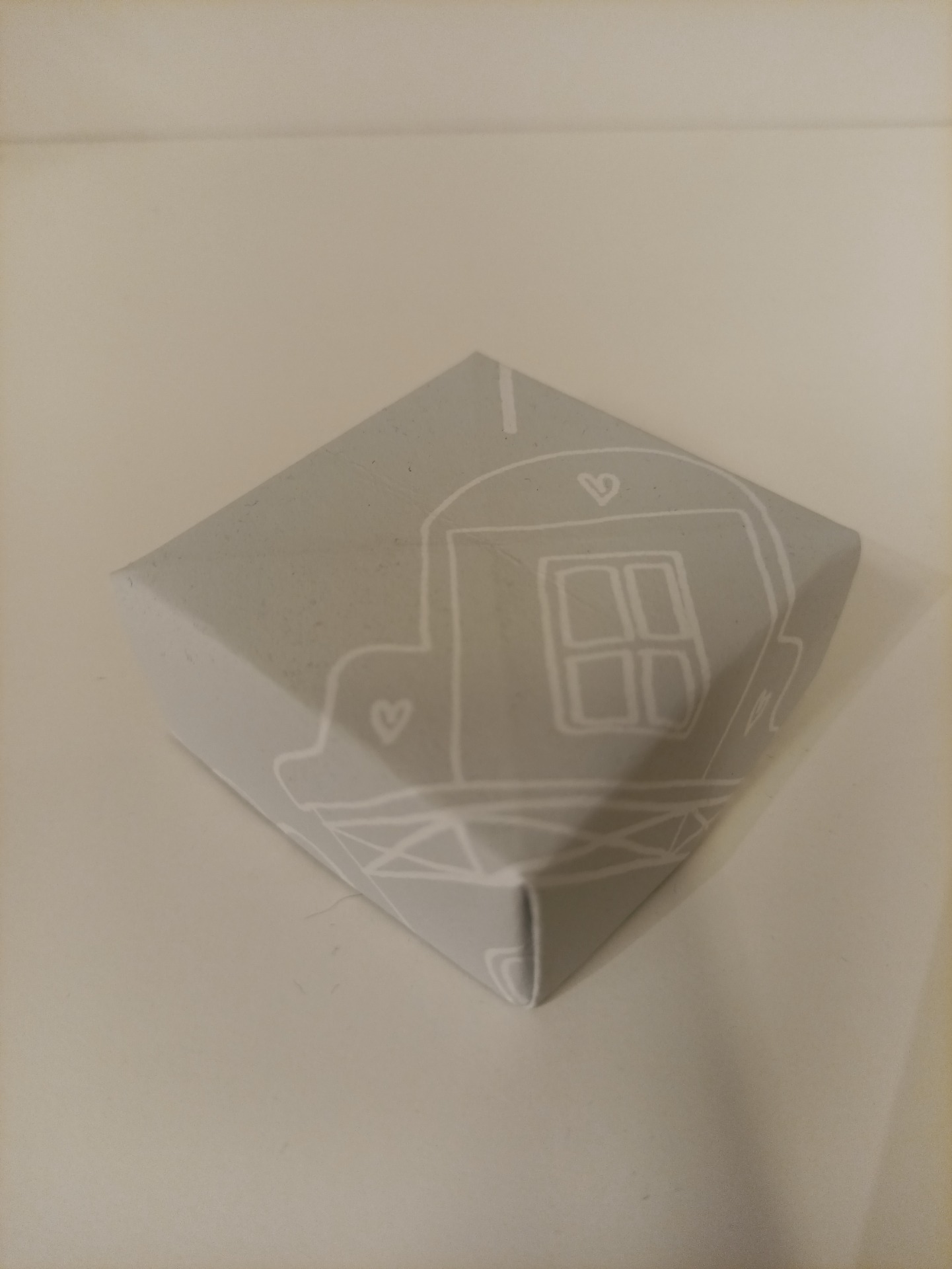Gaveboks laget i tapetmateriale. Boksene er laget slik at str. 9 passer akkurat oppi 10, str. 8 akkurat oppi 9, og videre. Dette for å kunne spare plass ved eventuelt lagring. Denne boksen er 6x6x3 cm.