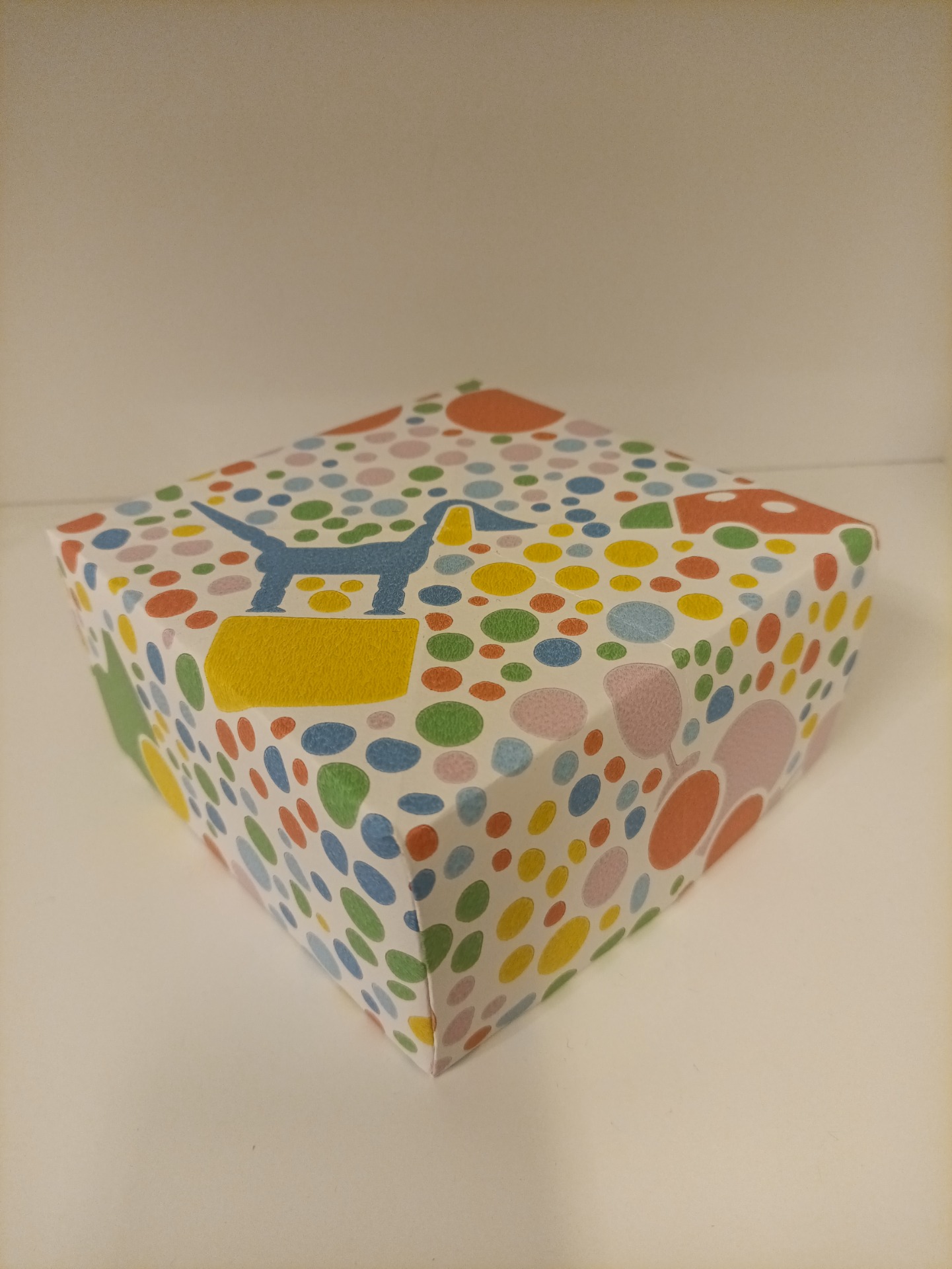 Gaveboks laget i tapetmateriale. Boksene er laget slik at str. 9 passer akkurat oppi 10, str. 8 akkurat oppi 9, og videre. Dette for å kunne spare plass ved eventuelt lagring. Denne boksen er 15,5x15,5x7,5 cm.
