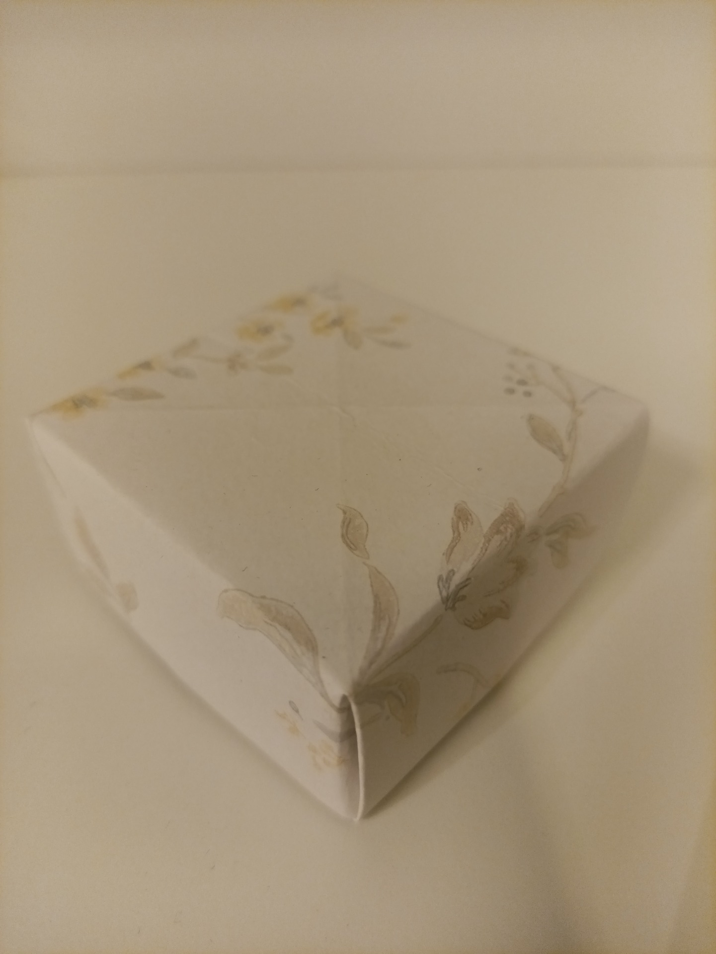 Gaveboks laget i tapetmateriale. Boksene er laget slik at str. 9 passer akkurat oppi 10, str. 8 akkurat oppi 9, og videre. Dette for å kunne spare plass ved eventuelt lagring. Denne boksen er 7x7x3,5 cm.