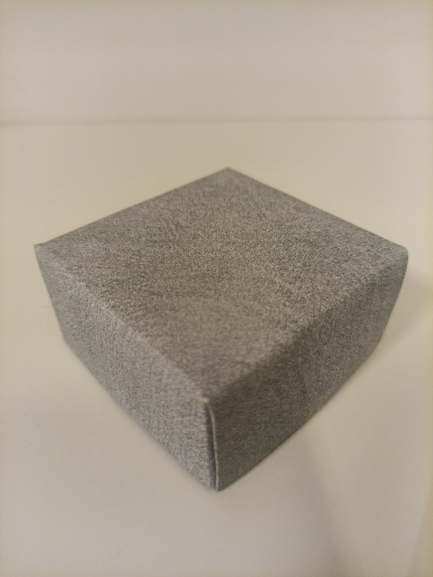 Gaveboks laget i tapetmateriale. Boksene er laget slik at str. 9 passer akkurat oppi 10, str. 8 akkurat oppi 9, og videre. Dette for å kunne spare plass ved eventuelt lagring. Denne boksen er 7x7x3,5 cm.