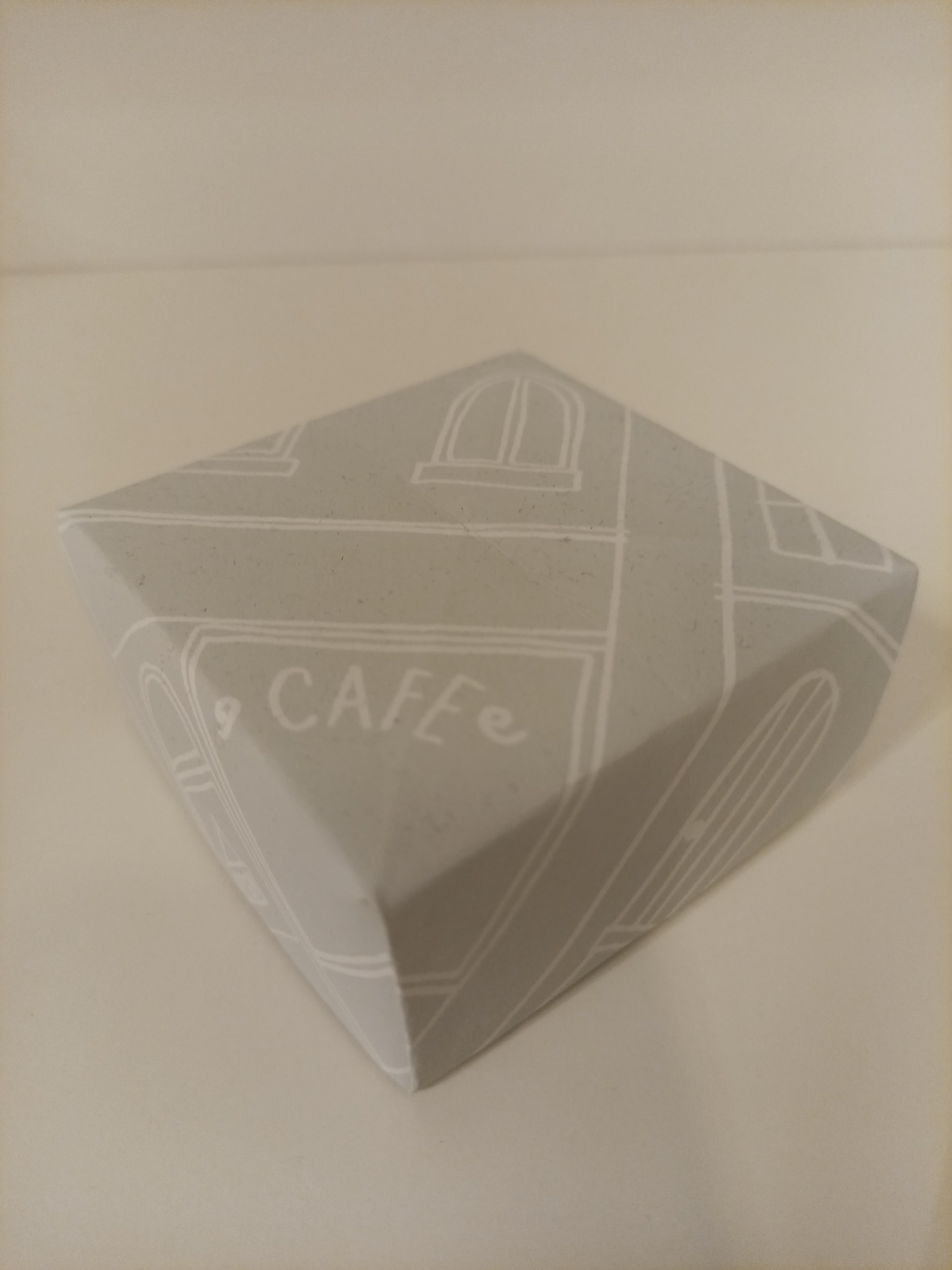 Gaveboks laget i tapetmateriale. Boksene er laget slik at str. 9 passer akkurat oppi 10, str. 8 akkurat oppi 9, og videre. Dette for å kunne spare plass ved eventuelt lagring. Denne boksen er 8x8x4 cm.