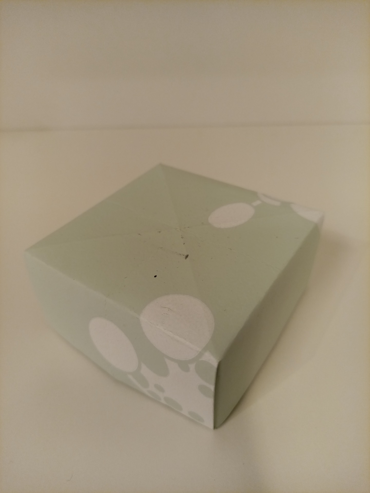 Gaveboks laget i tapetmateriale. Boksene er laget slik at str. 9 passer akkurat oppi 10, str. 8 akkurat oppi 9, og videre. Dette for å kunne spare plass ved eventuelt lagring. Denne boksen er 9x9x4,5 cm.