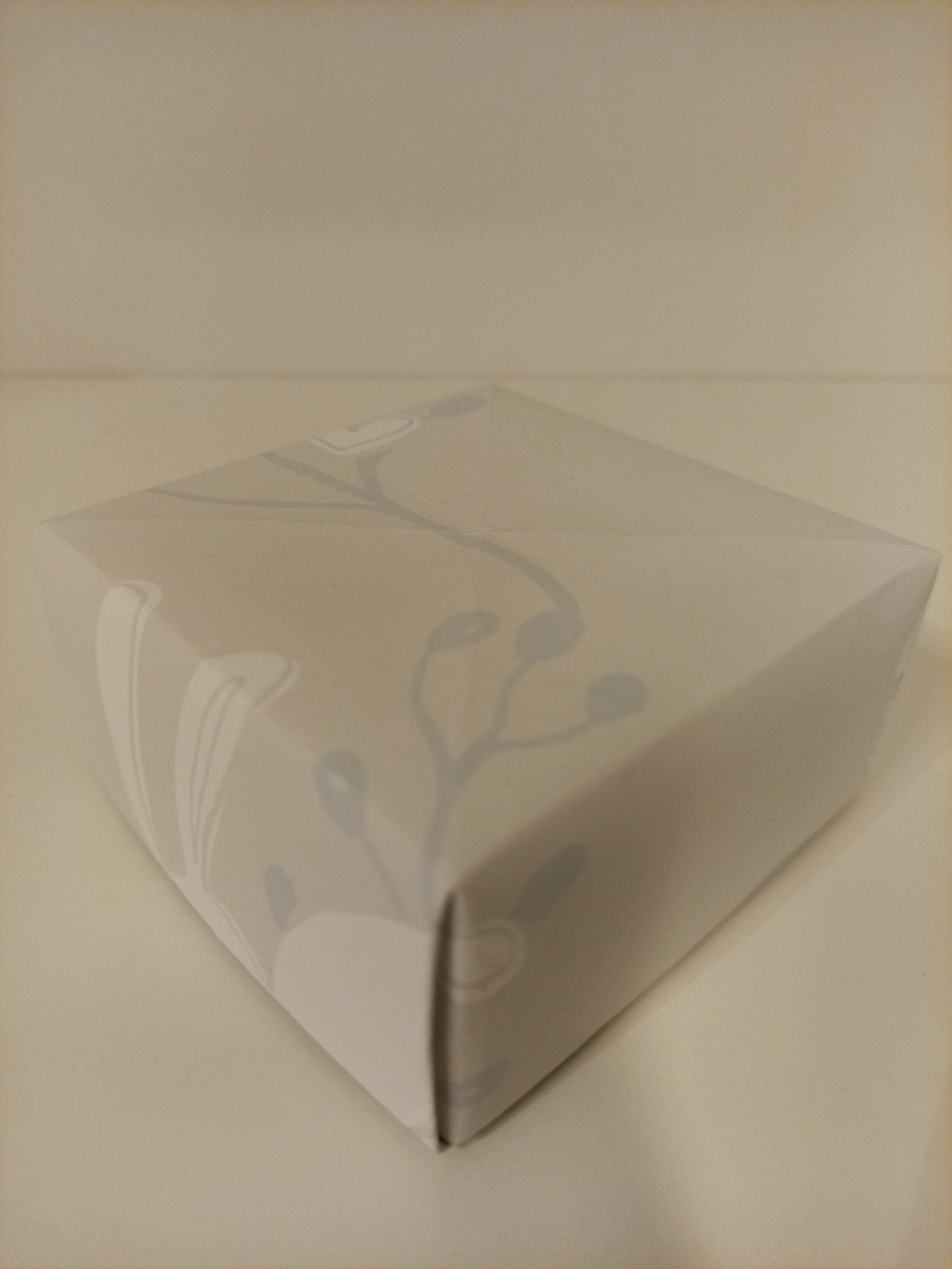 Gaveboks laget i tapetmateriale. Boksene er laget slik at str. 9 passer akkurat oppi 10, str. 8 akkurat oppi 9, og videre. Dette for å kunne spare plass ved eventuelt lagring. Denne boksen er 9x9x4,5 cm.