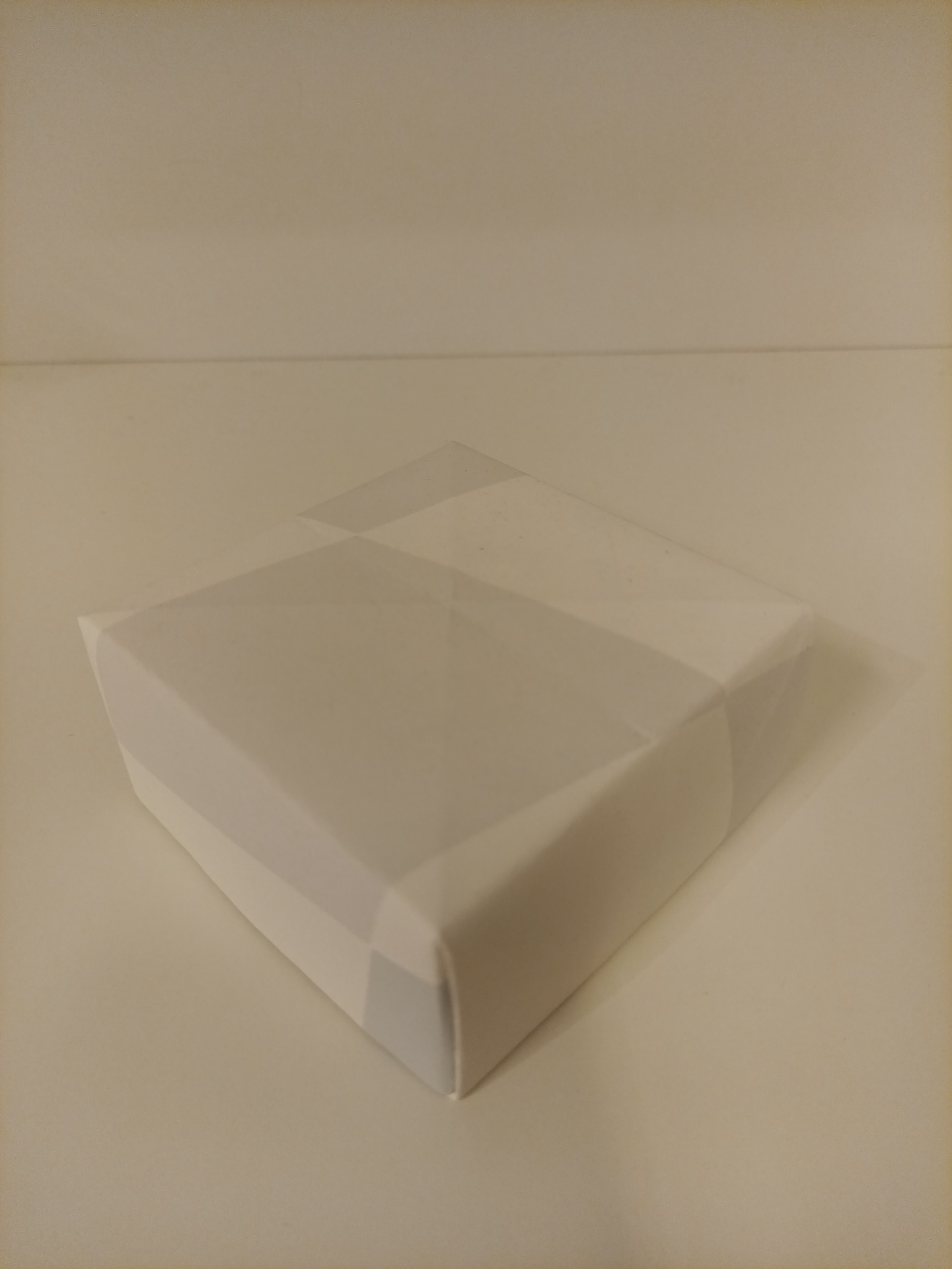 Gaveboks laget i tapetmateriale. Boksene er laget slik at str. 9 passer akkurat oppi 10, str. 8 akkurat oppi 9, og videre. Dette for å kunne spare plass ved eventuelt lagring. Denne boksen er 9x9x4,5 cm.