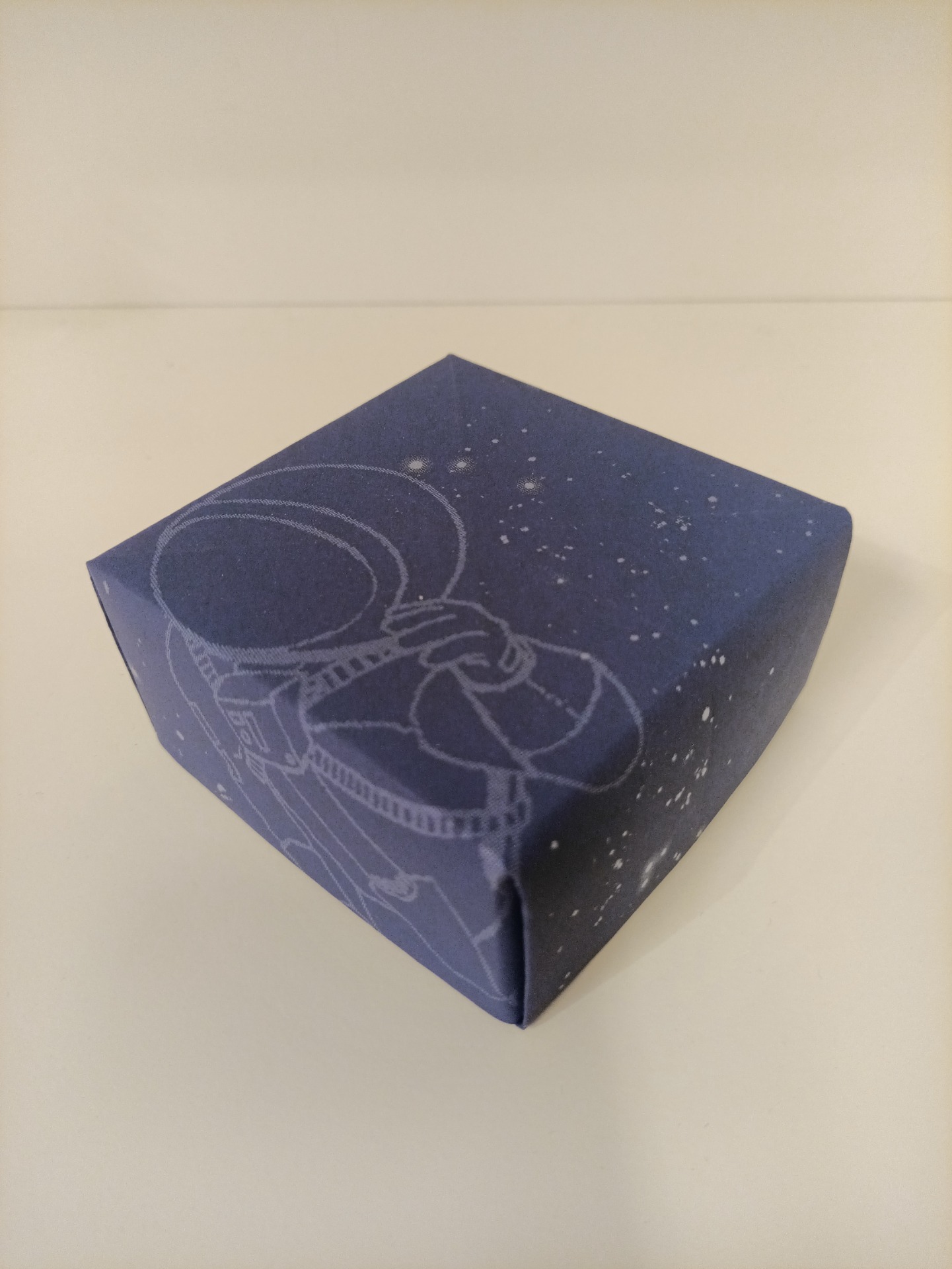 Gaveboks laget i tapetmateriale. Boksene er laget slik at str. 9 passer akkurat oppi 10, str. 8 akkurat oppi 9, og videre. Dette for å kunne spare plass ved eventuelt lagring. Denne boksen er 10x10x5 cm.