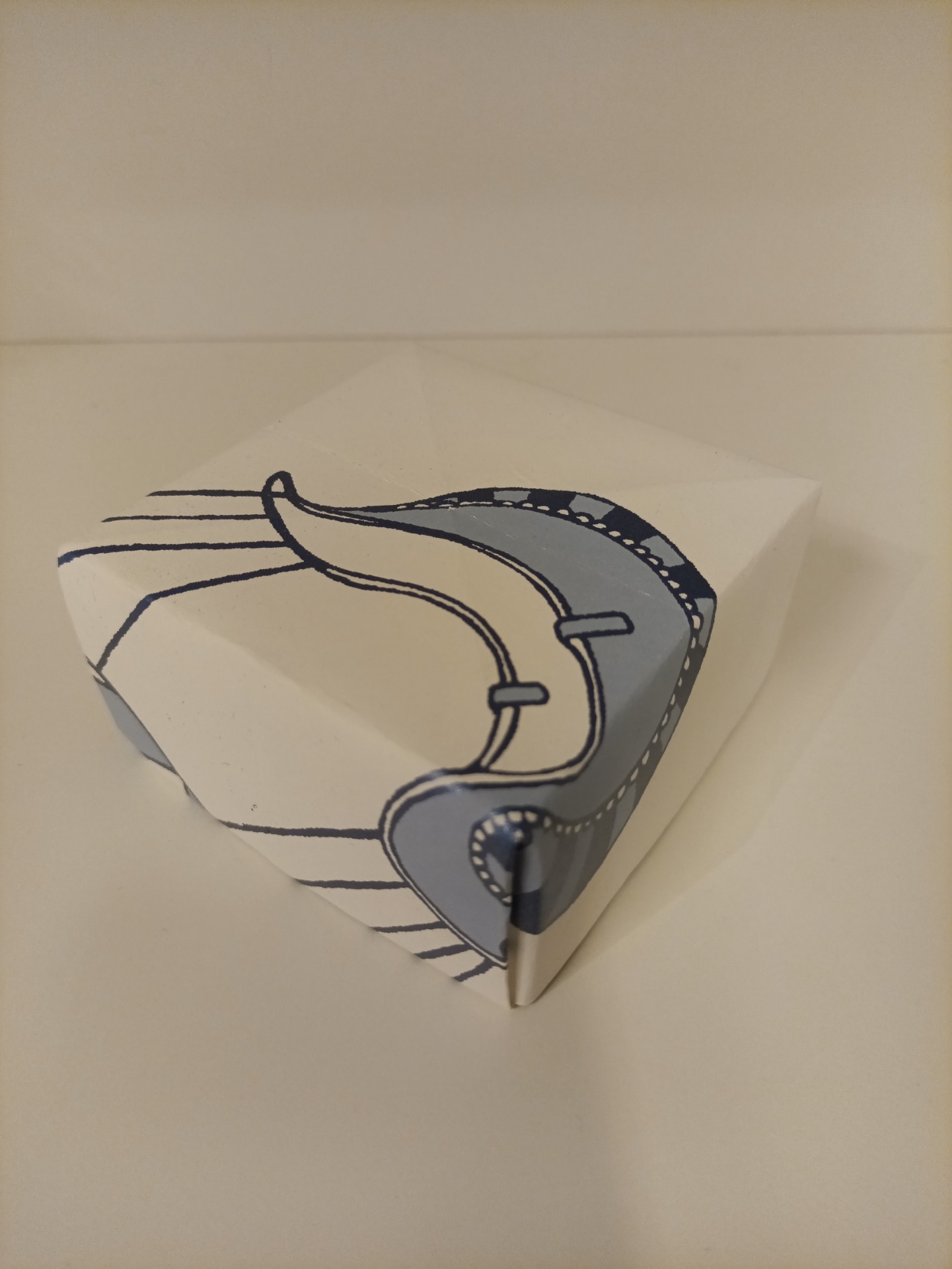 Gaveboks laget i tapetmateriale. Boksene er laget slik at str. 9 passer akkurat oppi 10, str. 8 akkurat oppi 9, og videre. Dette for å kunne spare plass ved eventuelt lagring. Denne boksen er 10x10x5 cm.