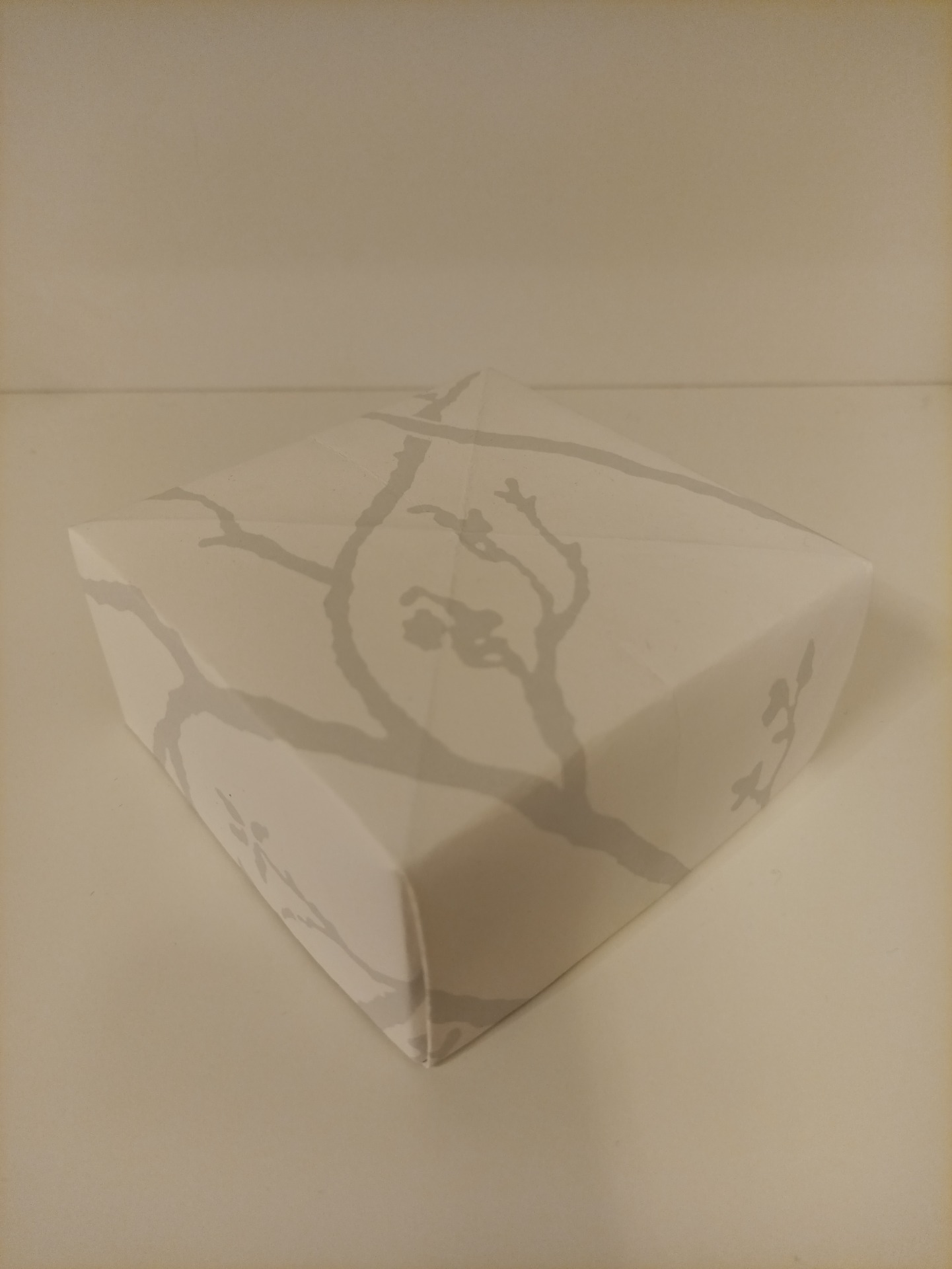 Gaveboks laget i tapetmateriale. Boksene er laget slik at str. 9 passer akkurat oppi 10, str. 8 akkurat oppi 9, og videre. Dette for å kunne spare plass ved eventuelt lagring. Denne boksen er 11x11x5,5 cm.