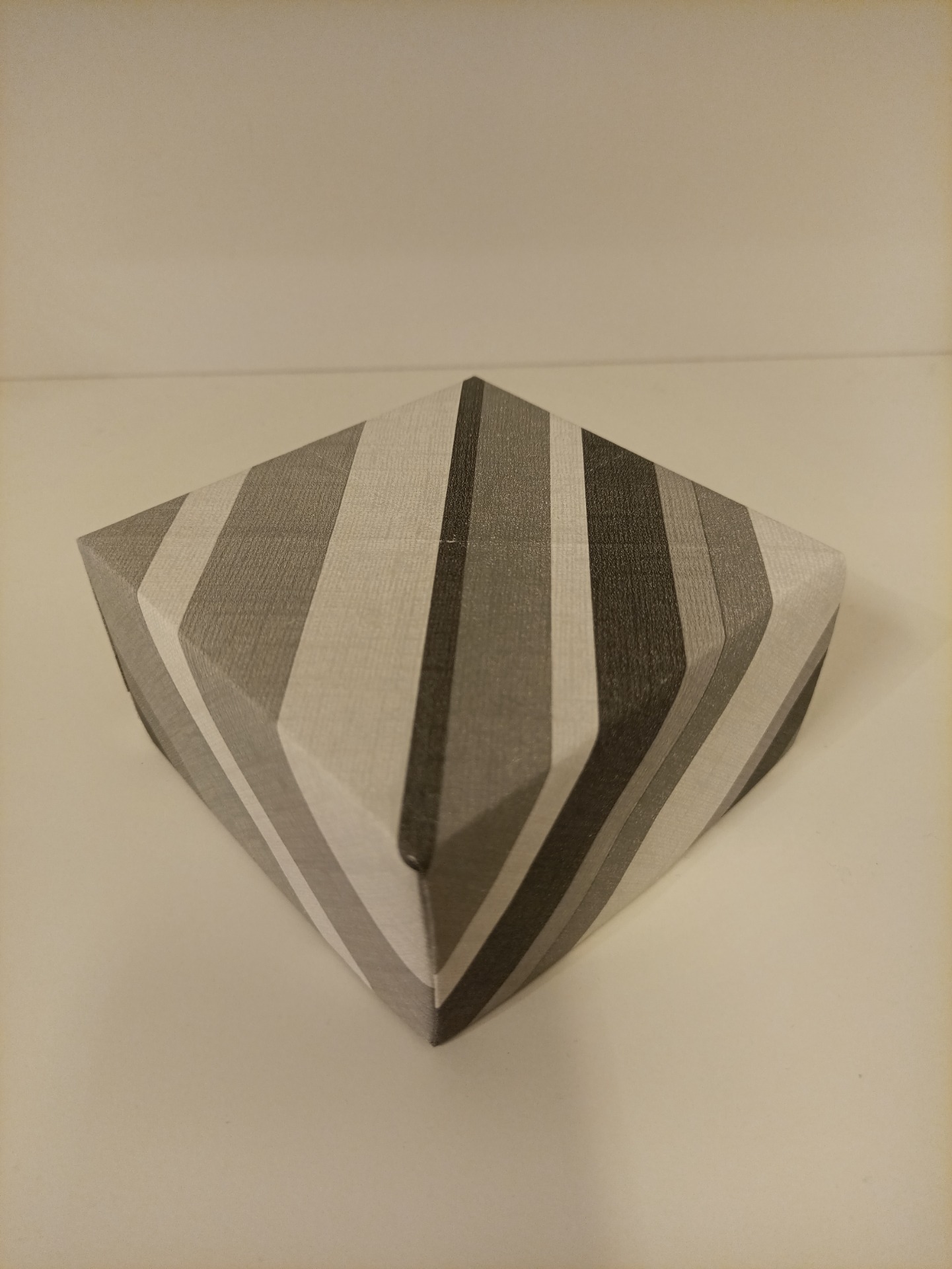 Gaveboks laget i tapetmateriale. Boksene er laget slik at str. 9 passer akkurat oppi 10, str. 8 akkurat oppi 9, og videre. Dette for å kunne spare plass ved eventuelt lagring. Denne boksen er 11x11x5,5 cm.