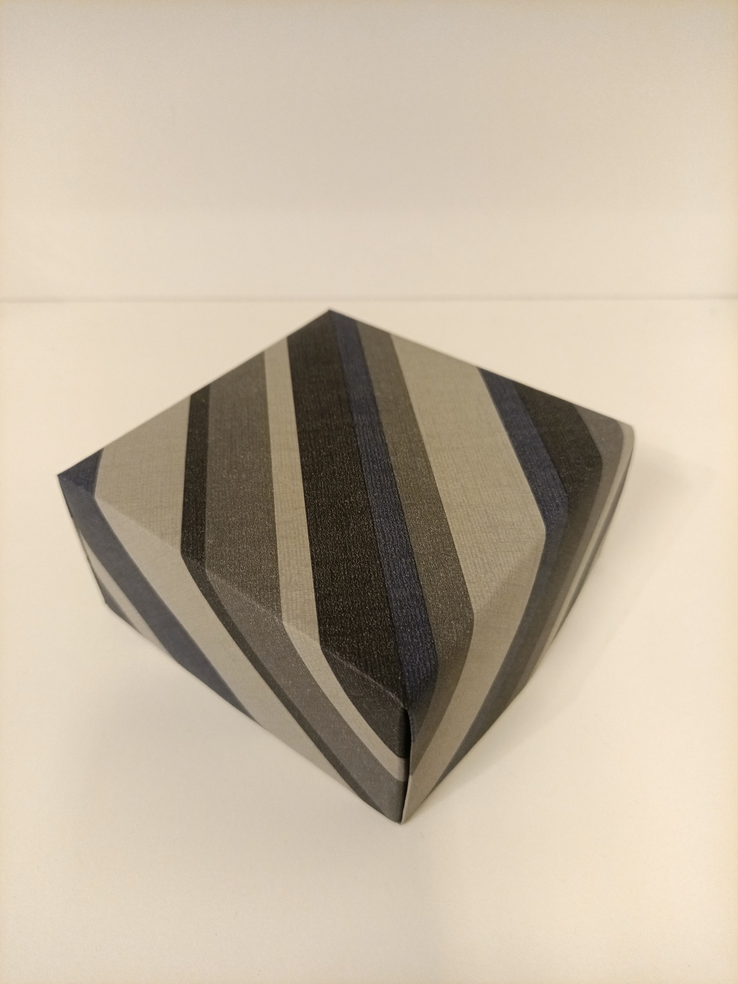 Gaveboks laget i tapetmateriale. Boksene er laget slik at str. 9 passer akkurat oppi 10, str. 8 akkurat oppi 9, og videre. Dette for å kunne spare plass ved eventuelt lagring. Denne boksen er 11x11x5,5 cm.