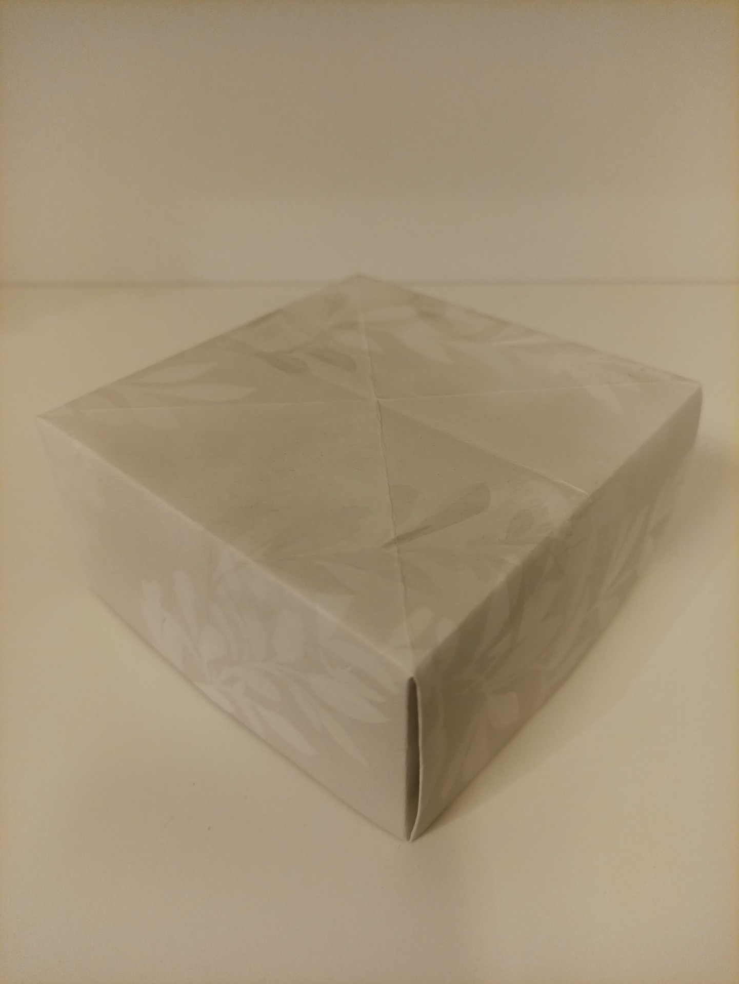 Gaveboks laget i tapetmateriale. Boksene er laget slik at str. 9 passer akkurat oppi 10, str. 8 akkurat oppi 9, og videre. Dette for å kunne spare plass ved eventuelt lagring. Denne boksen er 12x12x6 cm.