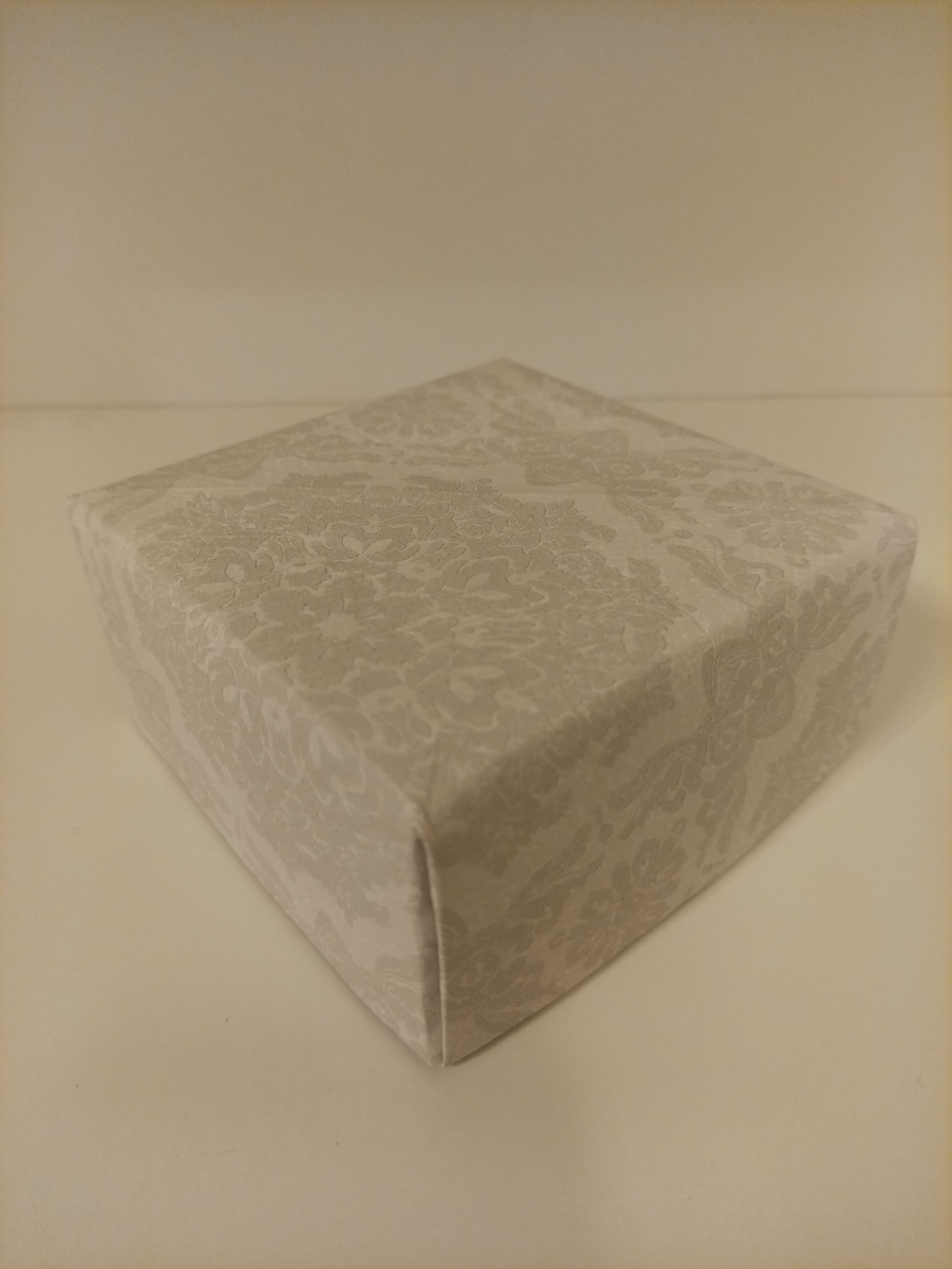 Gaveboks laget i tapetmateriale. Boksene er laget slik at str. 9 passer akkurat oppi 10, str. 8 akkurat oppi 9, og videre. Dette for å kunne spare plass ved eventuelt lagring. Denne boksen er 12x12x6 cm.