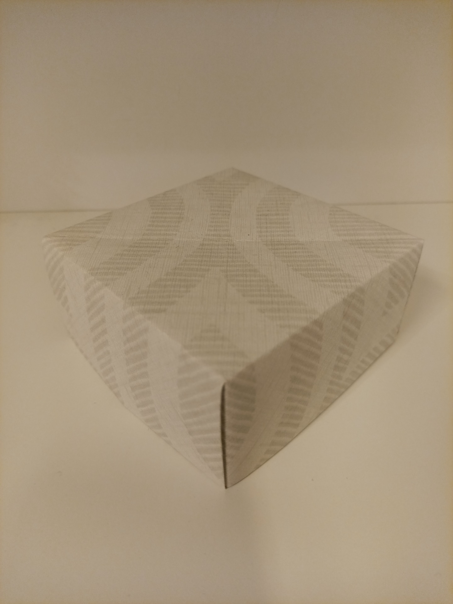 Gaveboks laget i tapetmateriale. Boksene er laget slik at str. 9 passer akkurat oppi 10, str. 8 akkurat oppi 9, og videre. Dette for å kunne spare plass ved eventuelt lagring. Denne boksen er 12x12x6 cm.