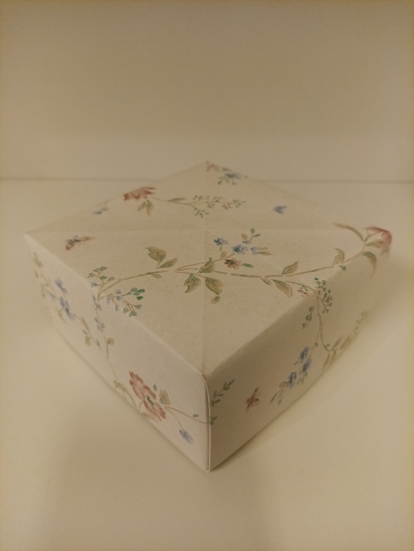 Gaveboks laget i tapetmateriale. Boksene er laget slik at str. 9 passer akkurat oppi 10, str. 8 akkurat oppi 9, og videre. Dette for å kunne spare plass ved eventuelt lagring. Denne boksen er 13,5x13,5x6,5 cm.