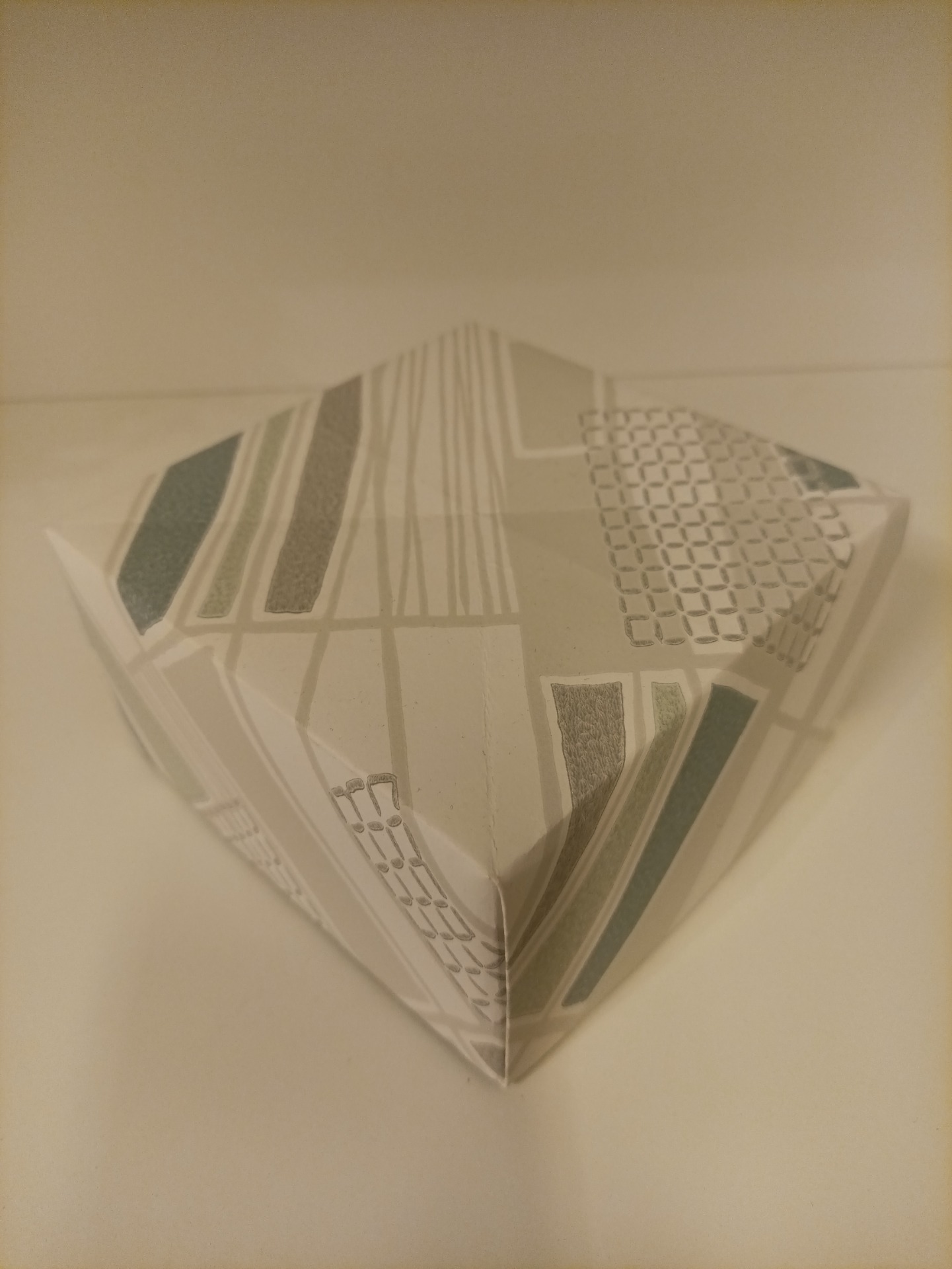 Gaveboks laget i tapetmateriale. Boksene er laget slik at str. 9 passer akkurat oppi 10, str. 8 akkurat oppi 9, og videre. Dette for å kunne spare plass ved eventuelt lagring. Denne boksen er 14,5x14,5x7 cm.