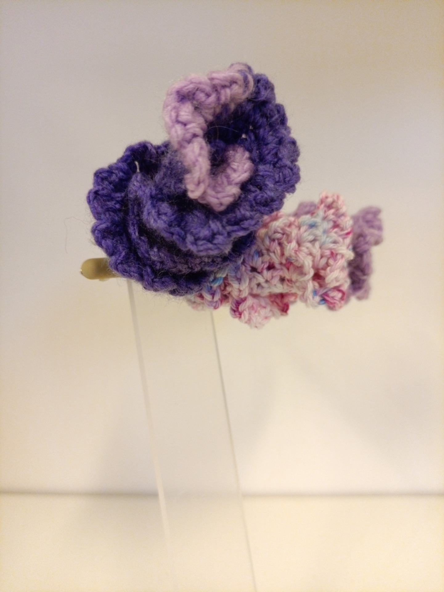 Hårklips med heklet dekor. Dekoren er limt på med kraftig hurtiglim. Tåler regn. Selve klipsen er 9 cm lang.