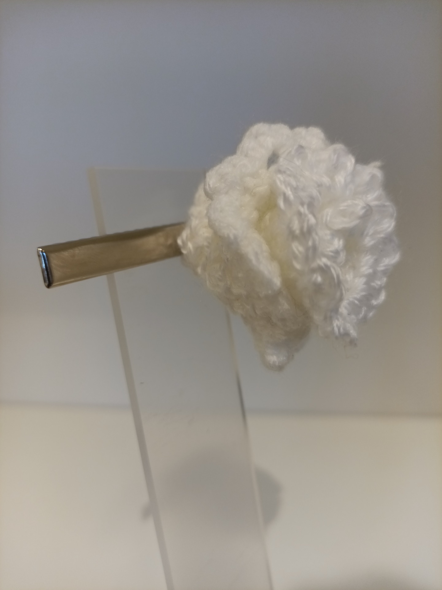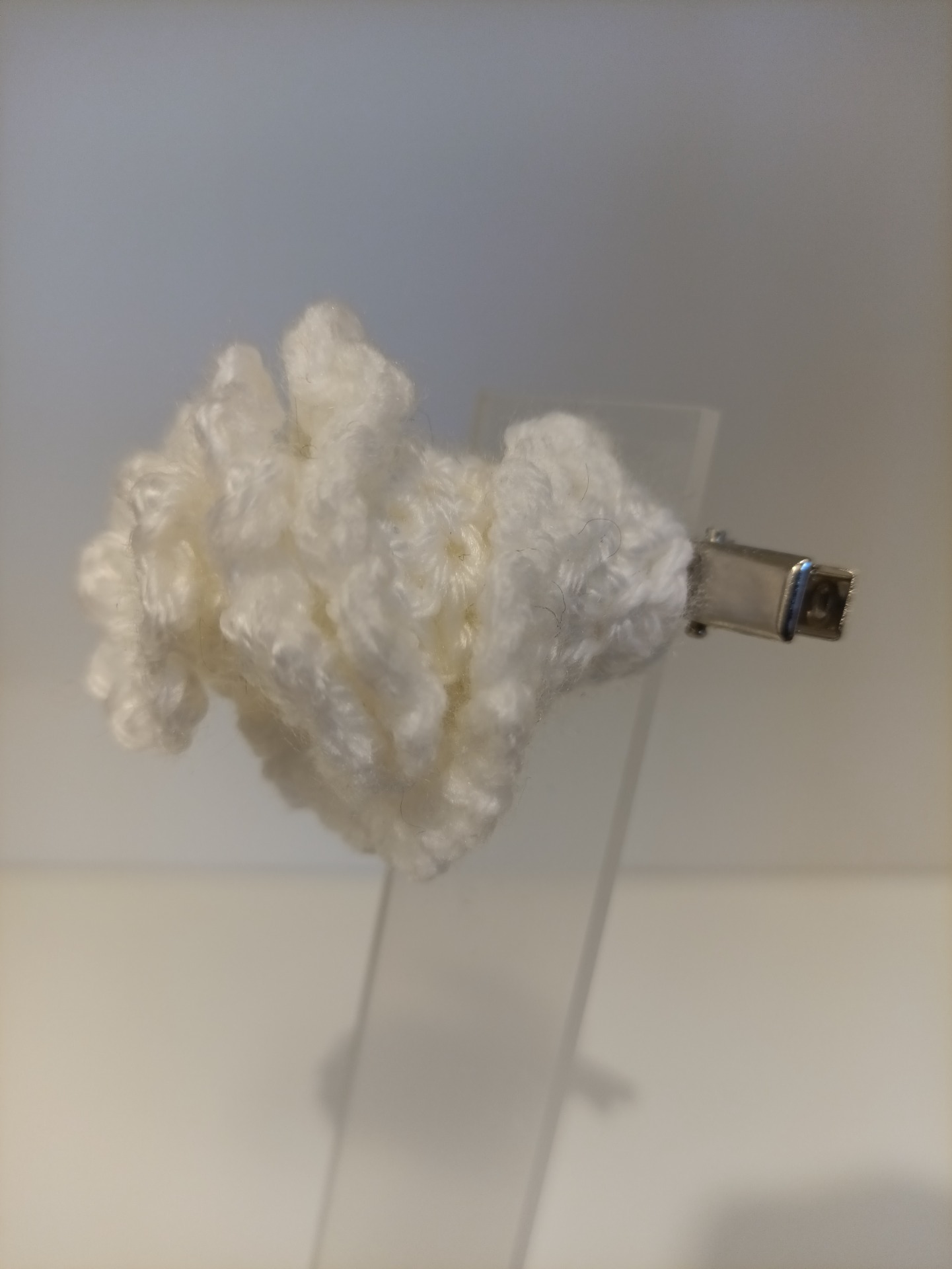 Hårklype med heklet blomst. Blomsten er limt på med kraftig hurtiglim. Selve klypa er 8 cm lang, 1 cm bred.