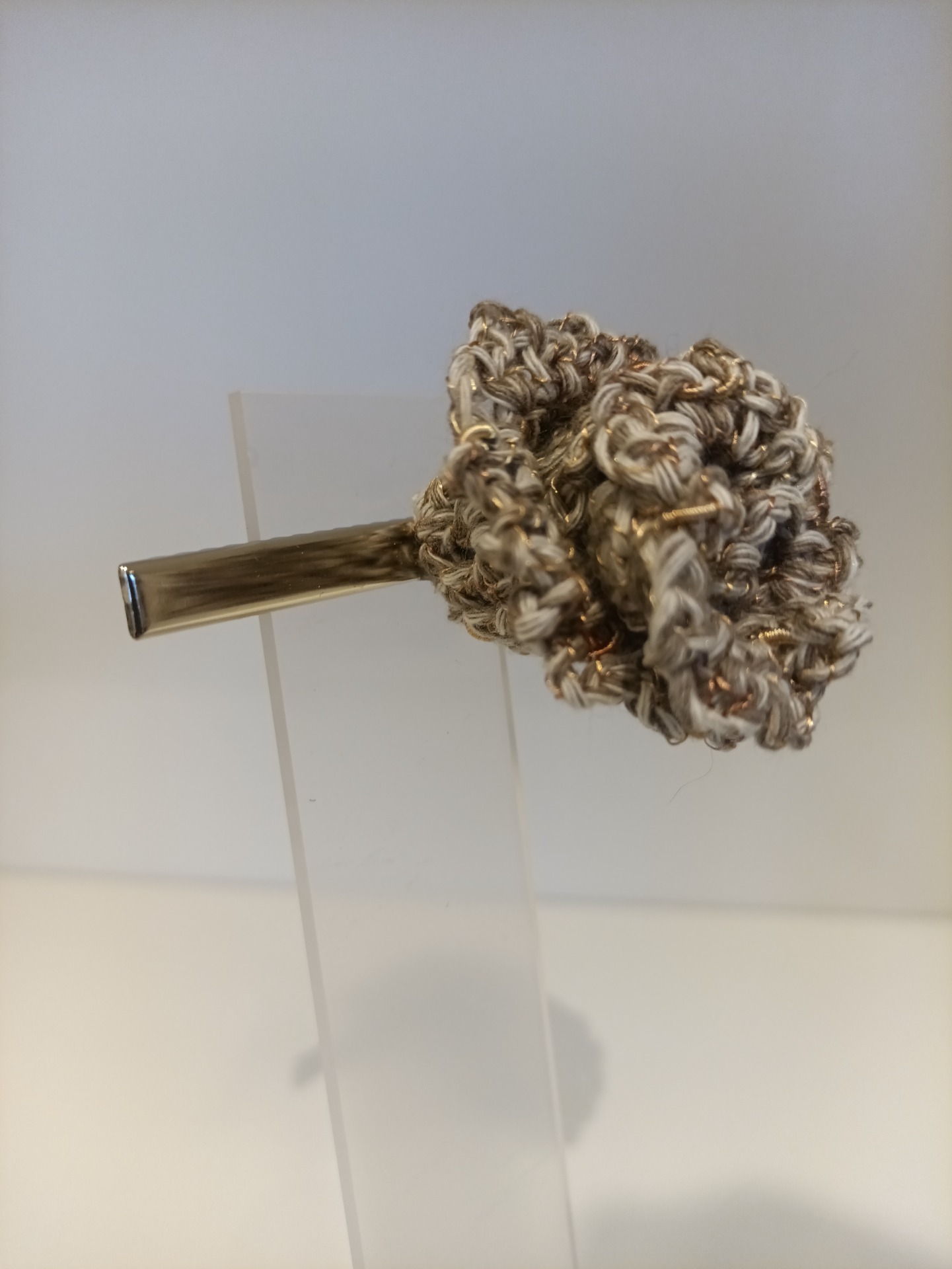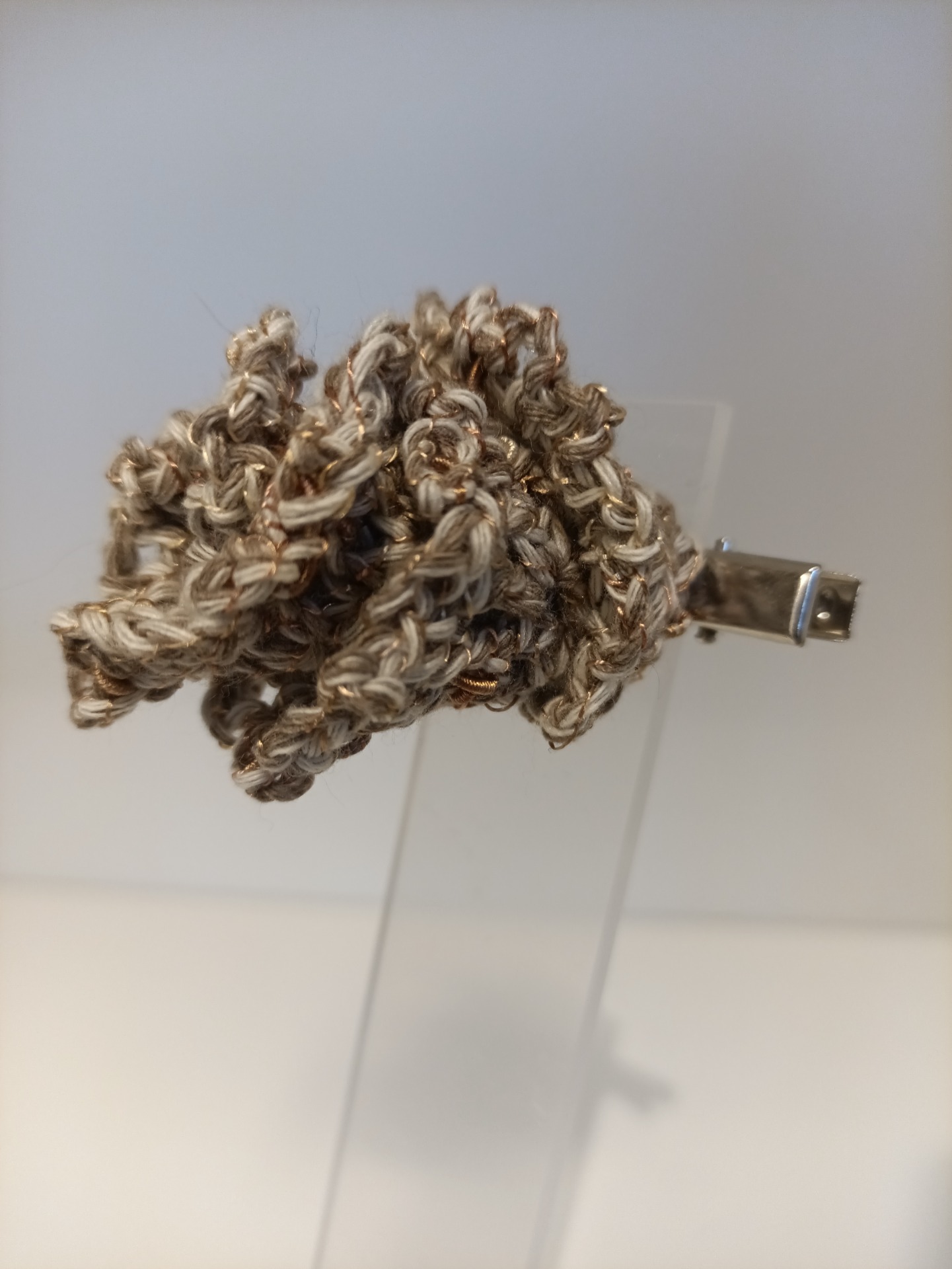 Hårklype med heklet blomst. Blomsten er limt på med kraftig hurtiglim. Selve klypa er 8 cm lang, 1 cm bred.