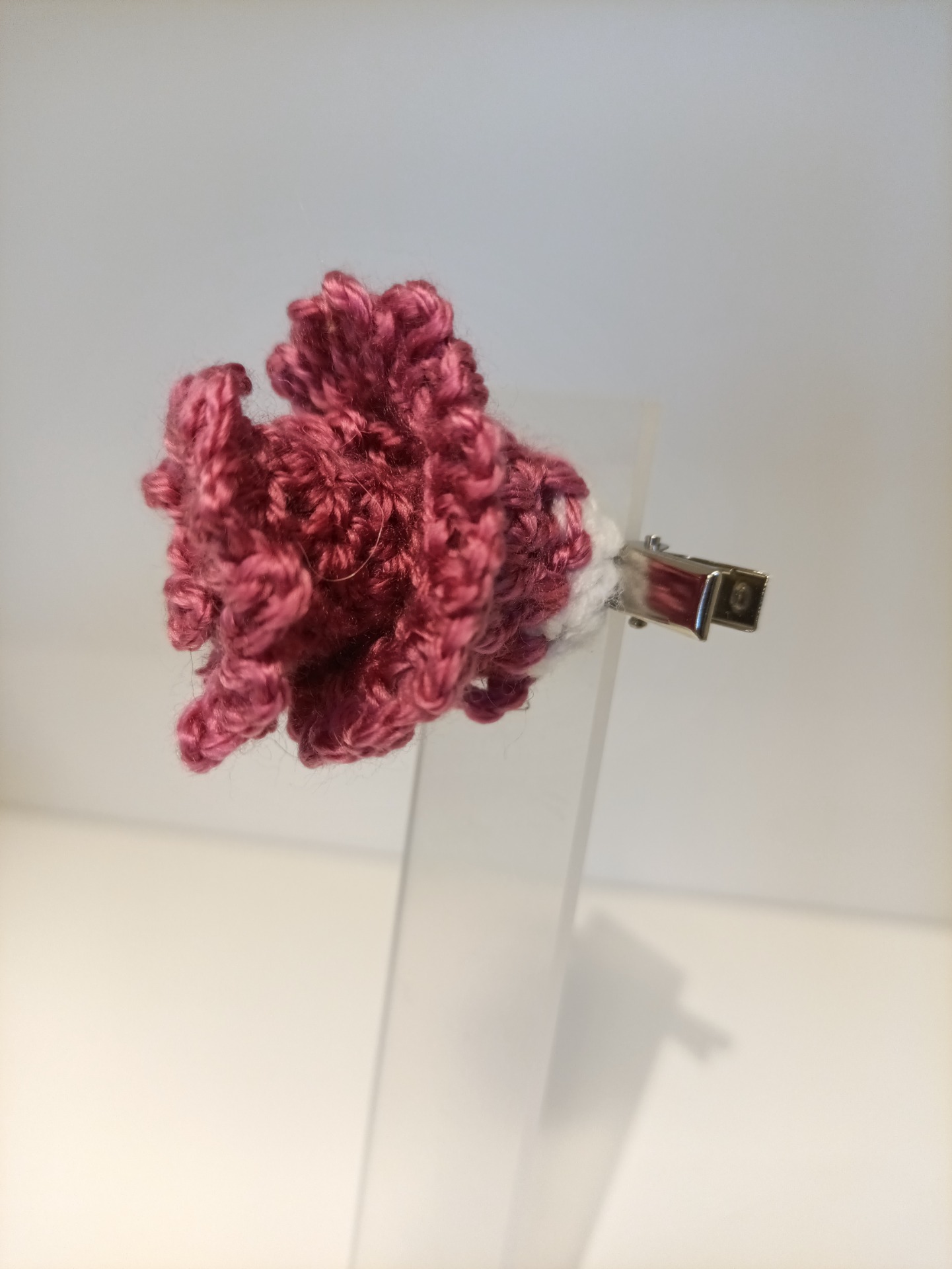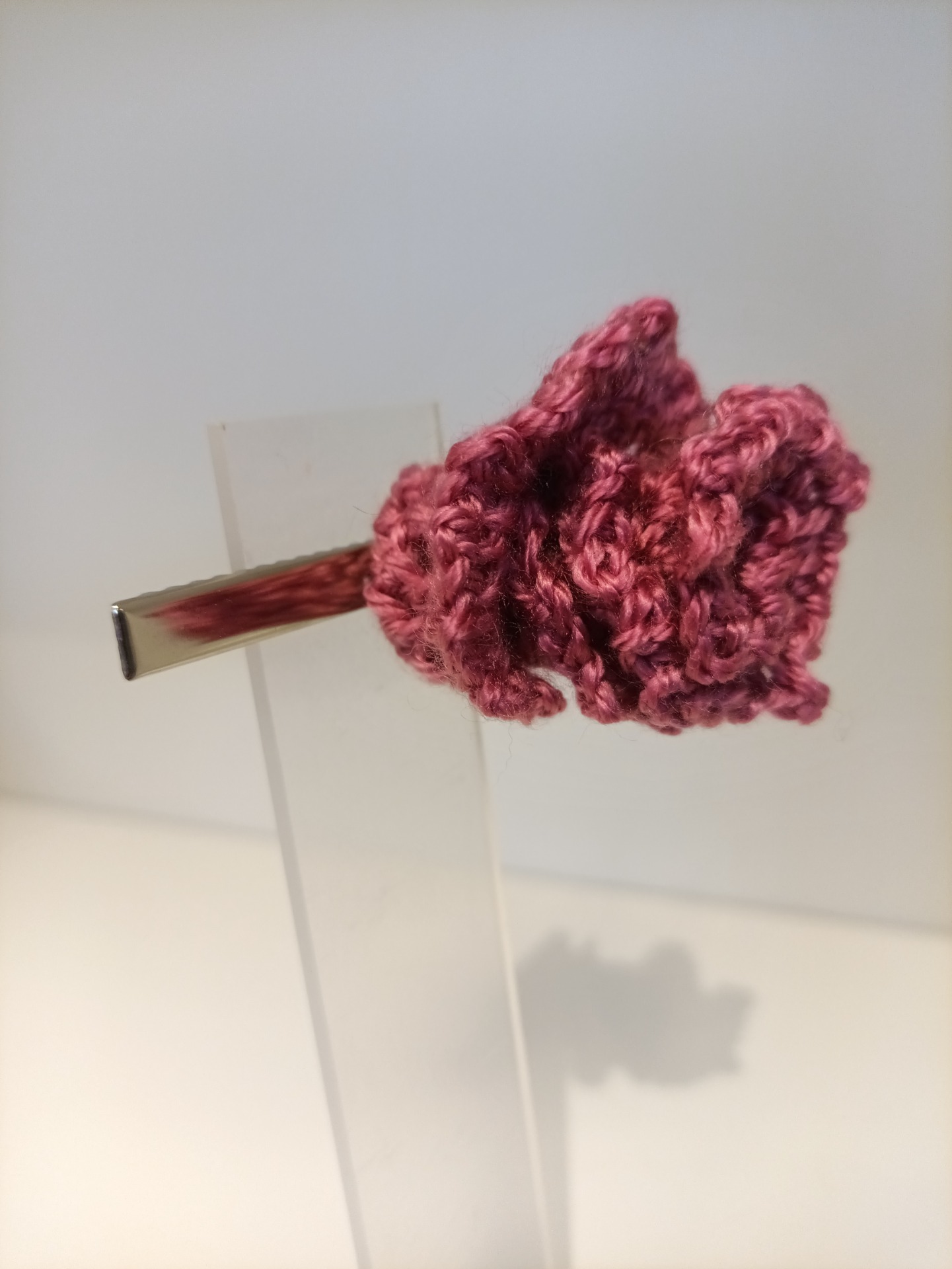 Hårklype med heklet blomst. Blomsten er limt på med kraftig hurtiglim. Selve klypa er 8 cm lang, 1 cm bred.