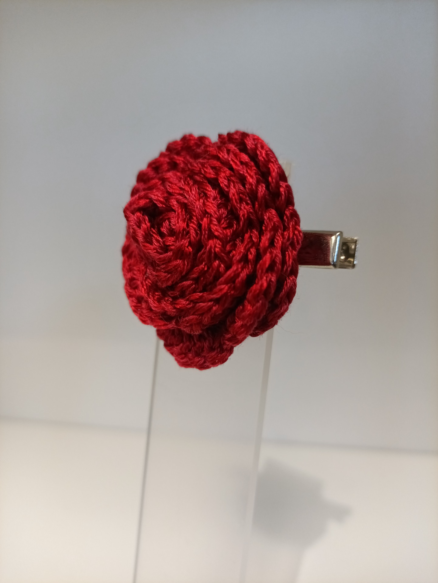 Hårklype med heklet blomst. Blomsten er limt på med kraftig hurtiglim. Selve klypa er 8 cm lang, 1 cm bred.