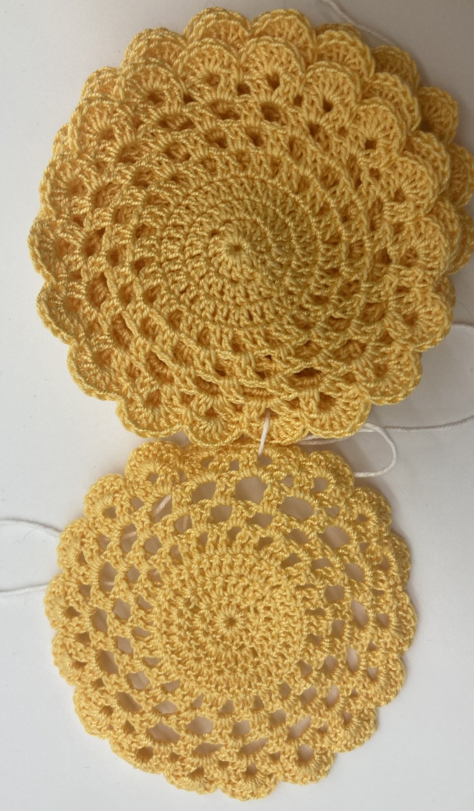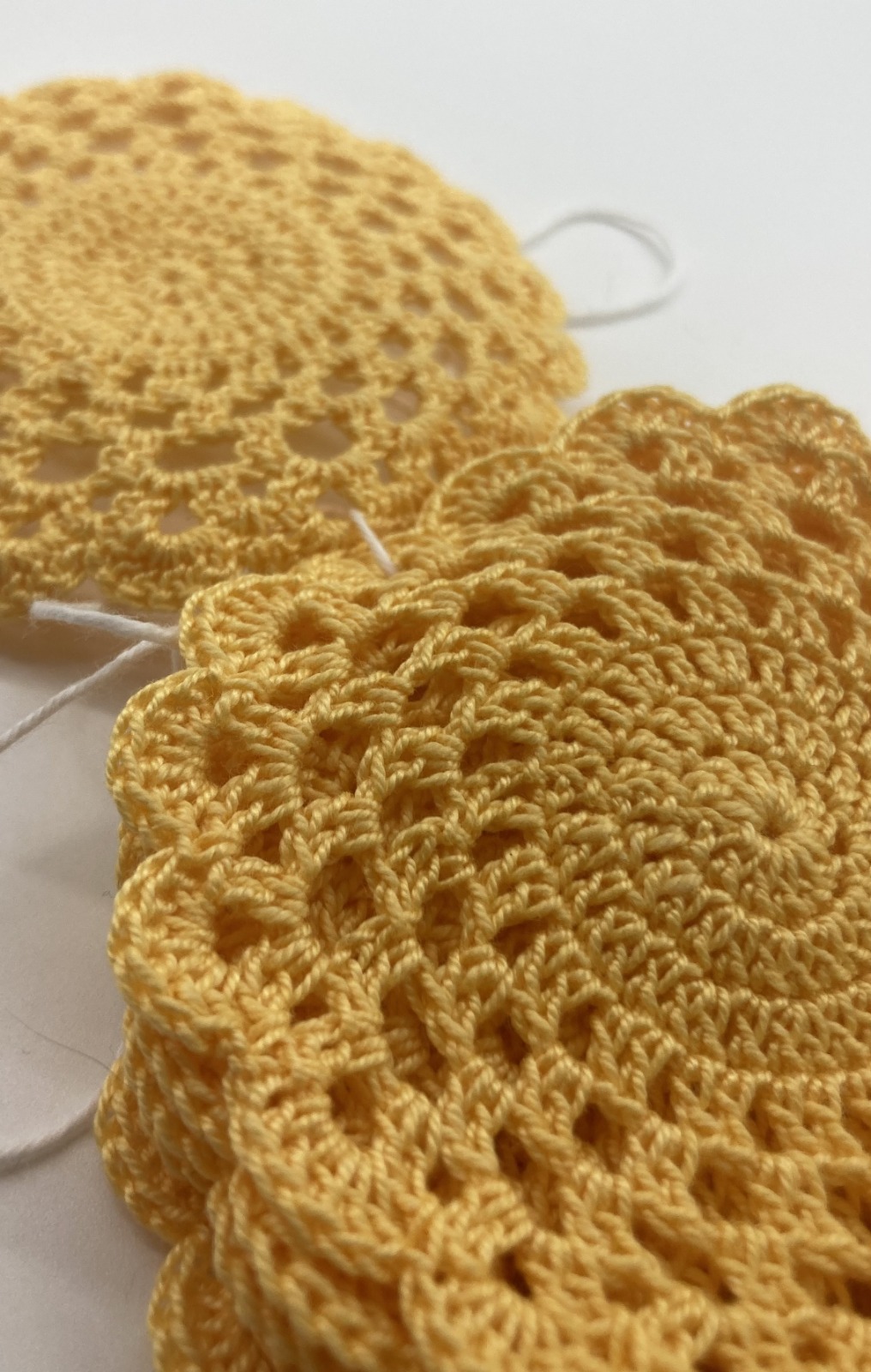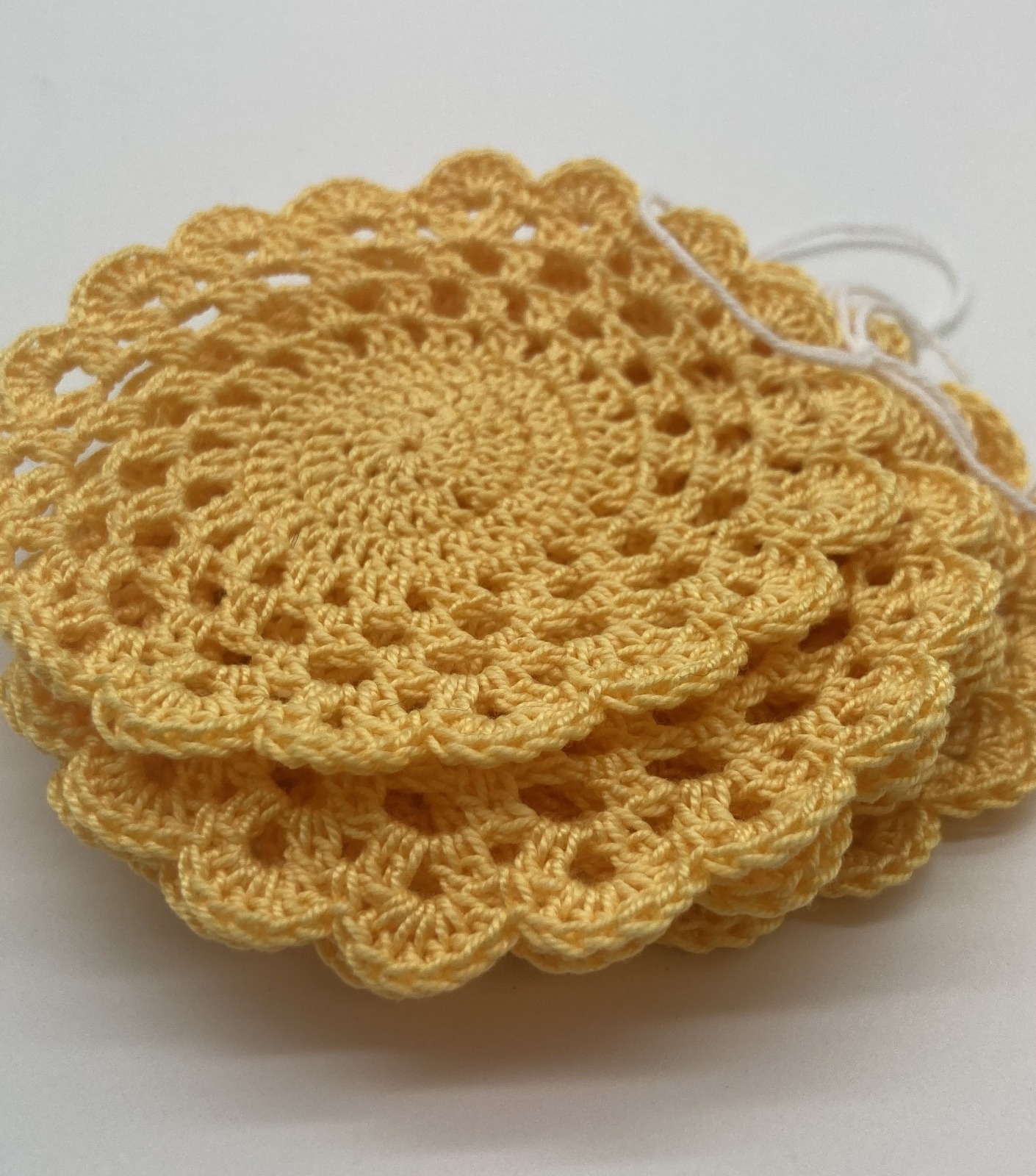 Heklede bordbrikker laget av Mamma B. Det er 6 stykker i hvert sett. NB! Potensiell bestillingsvare. Må forvente to ukers produksjonstid om det ikke finnes noen på lager.