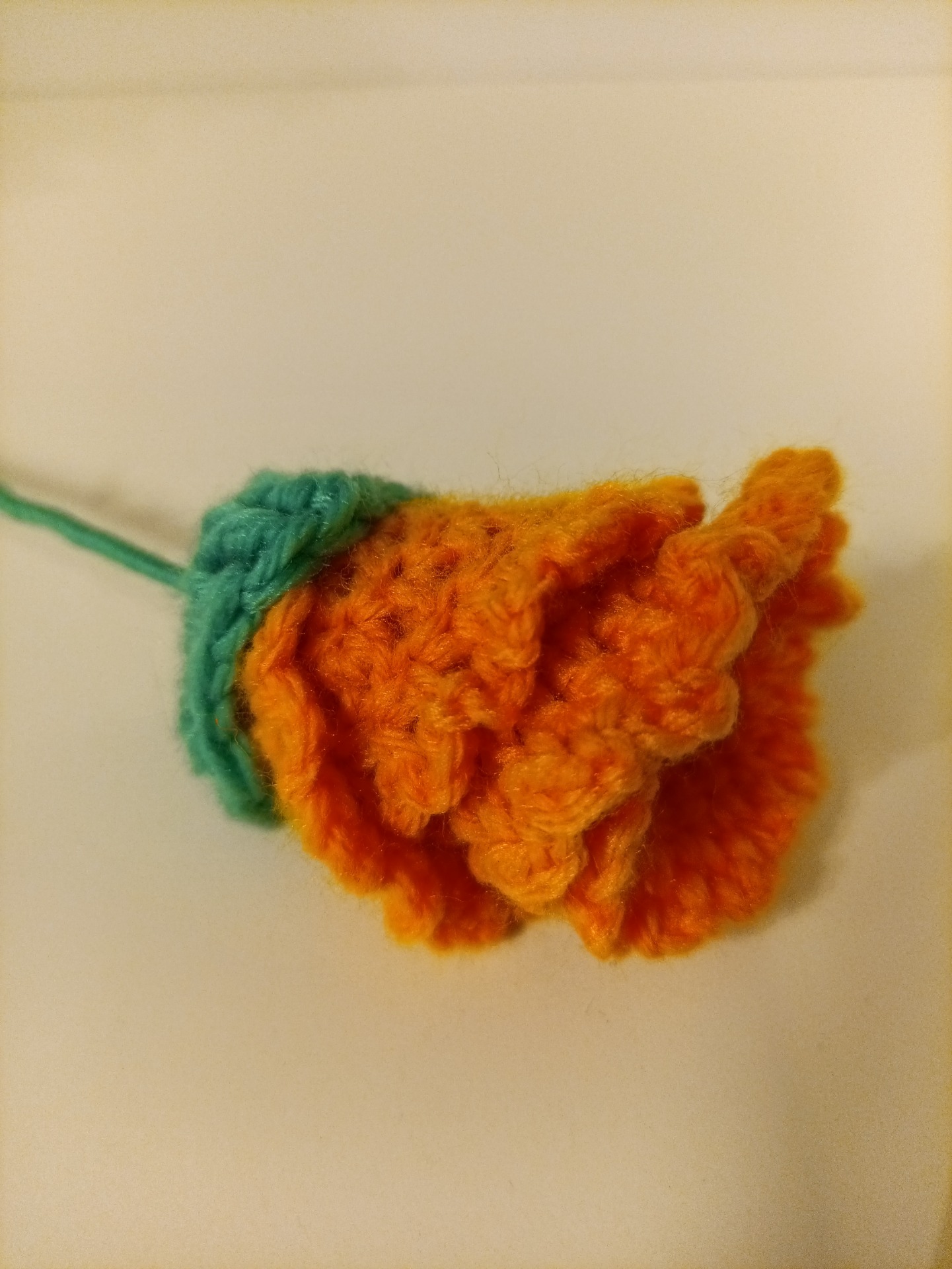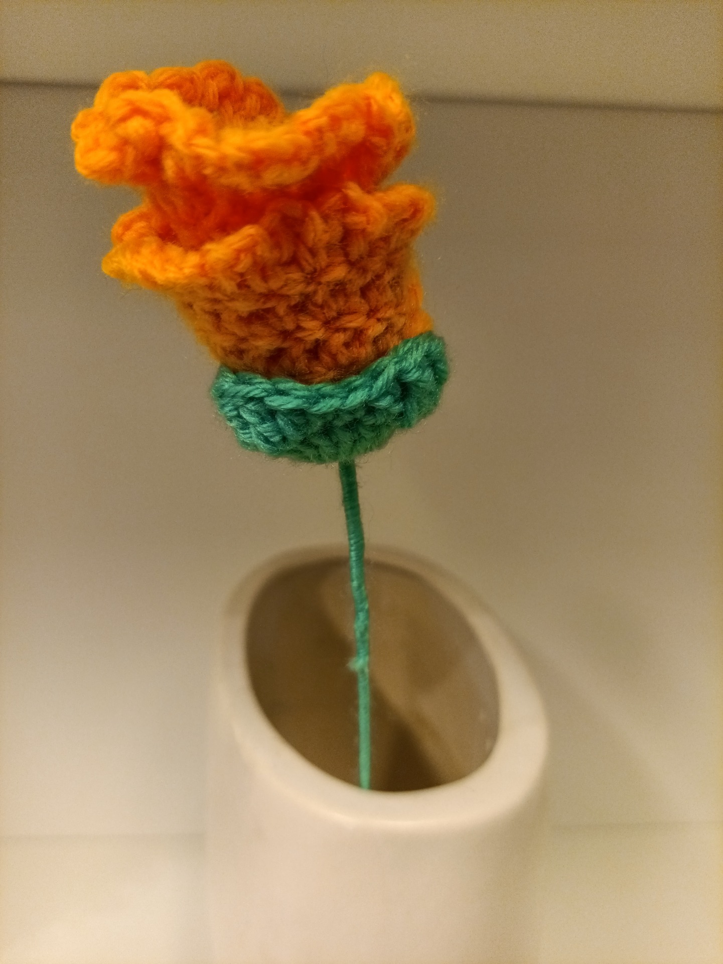 Heklet blomst med stilk i garndekket ståltråd. Stilken kan bøyes, og er omtrent 30 cm lang.