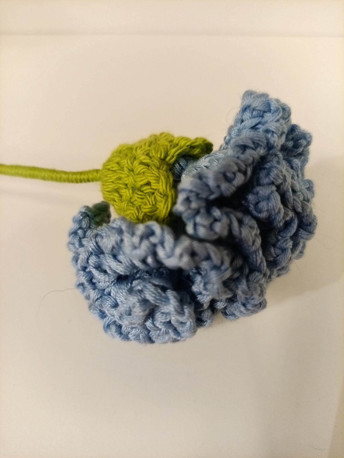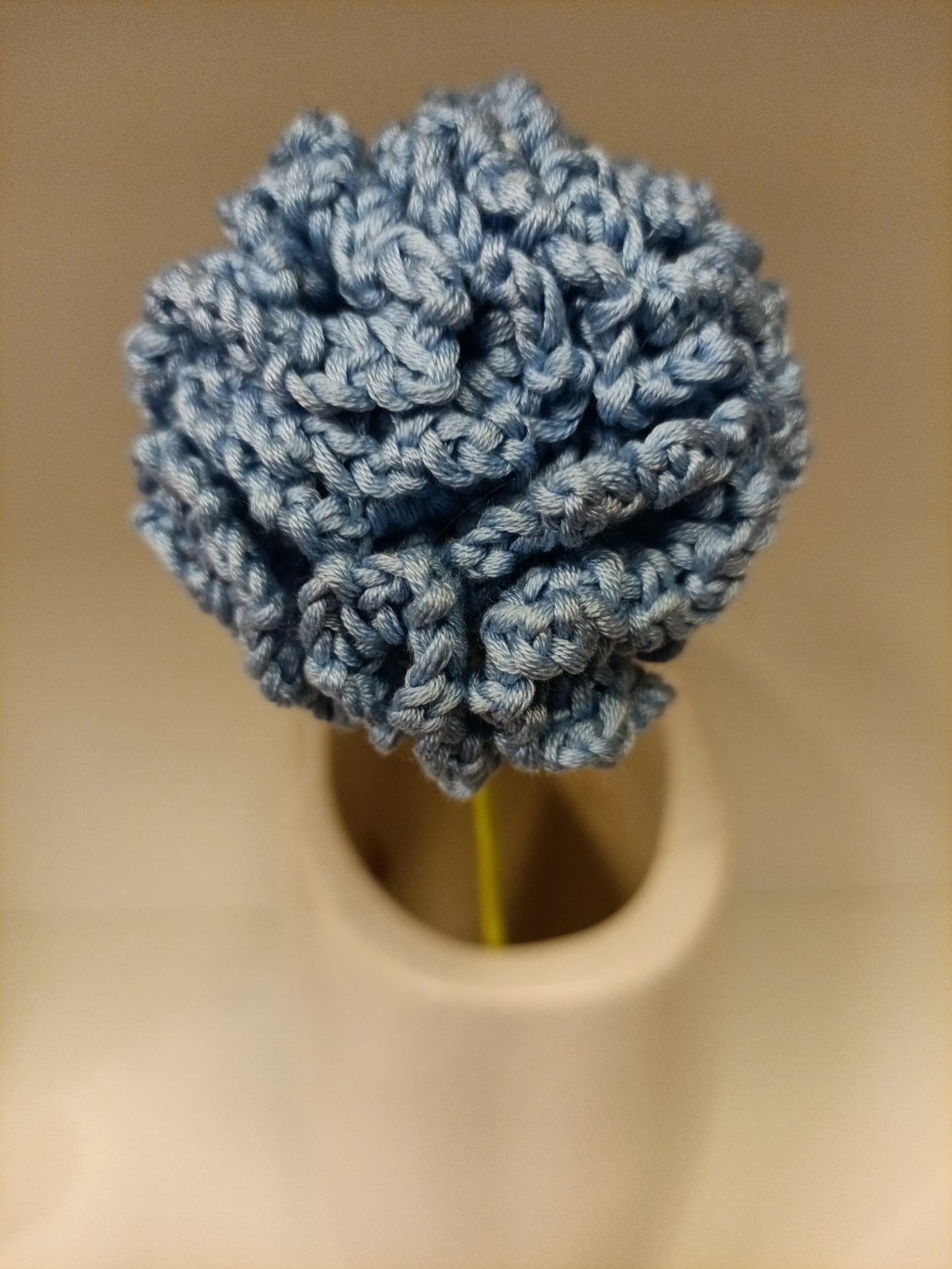Heklet blomst med stilk i garndekket ståltråd. Stilken kan bøyes, og er omtrent 30 cm lang.