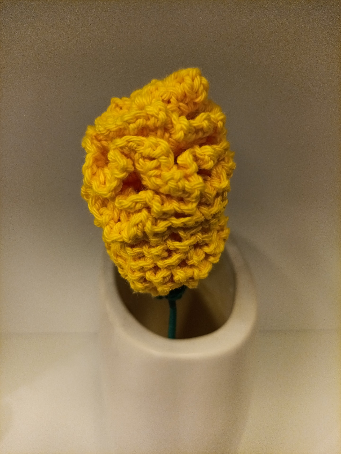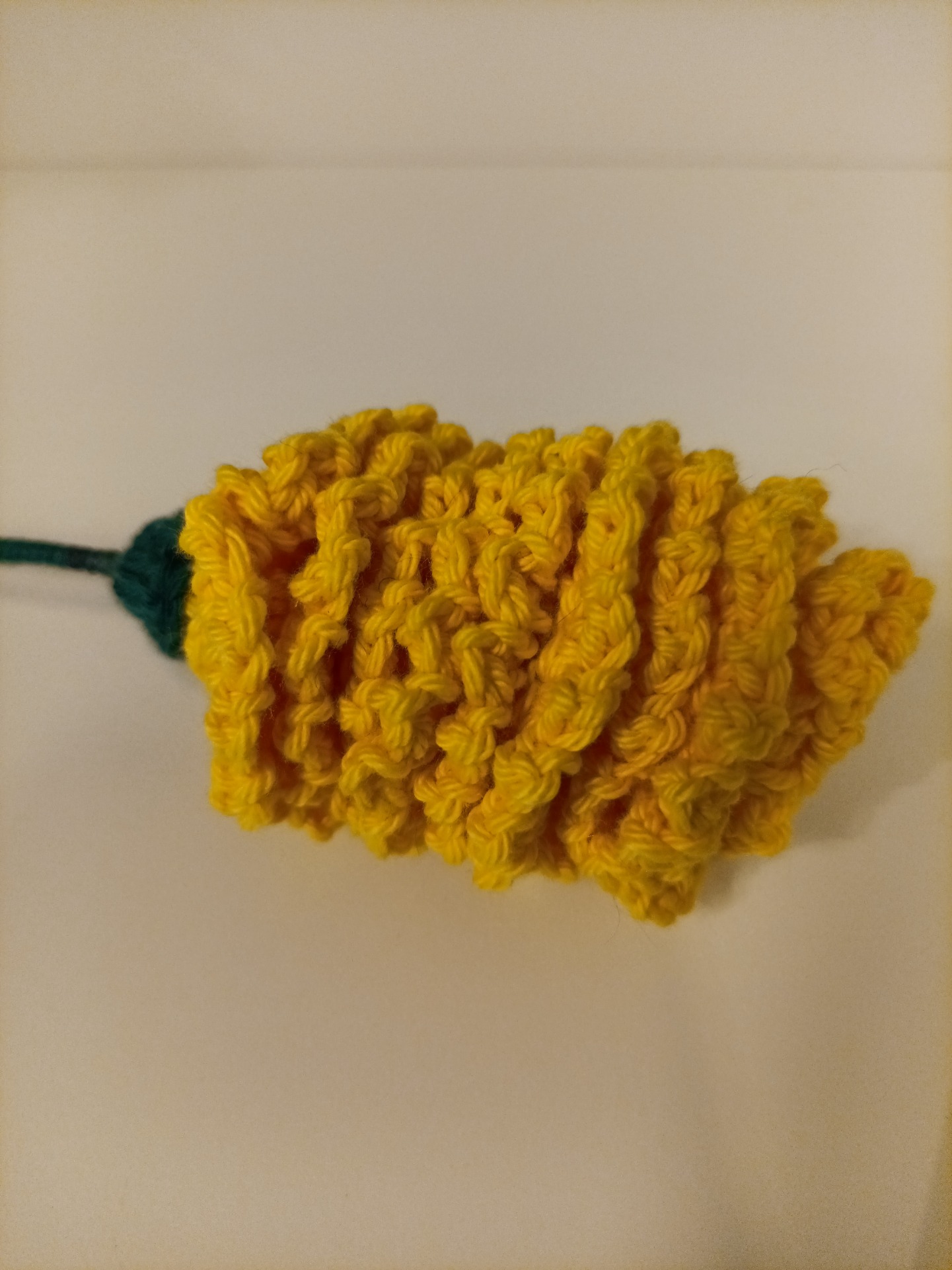 Heklet blomst med stilk i garndekket ståltråd. Stilken kan bøyes, og er omtrent 26 cm lang.