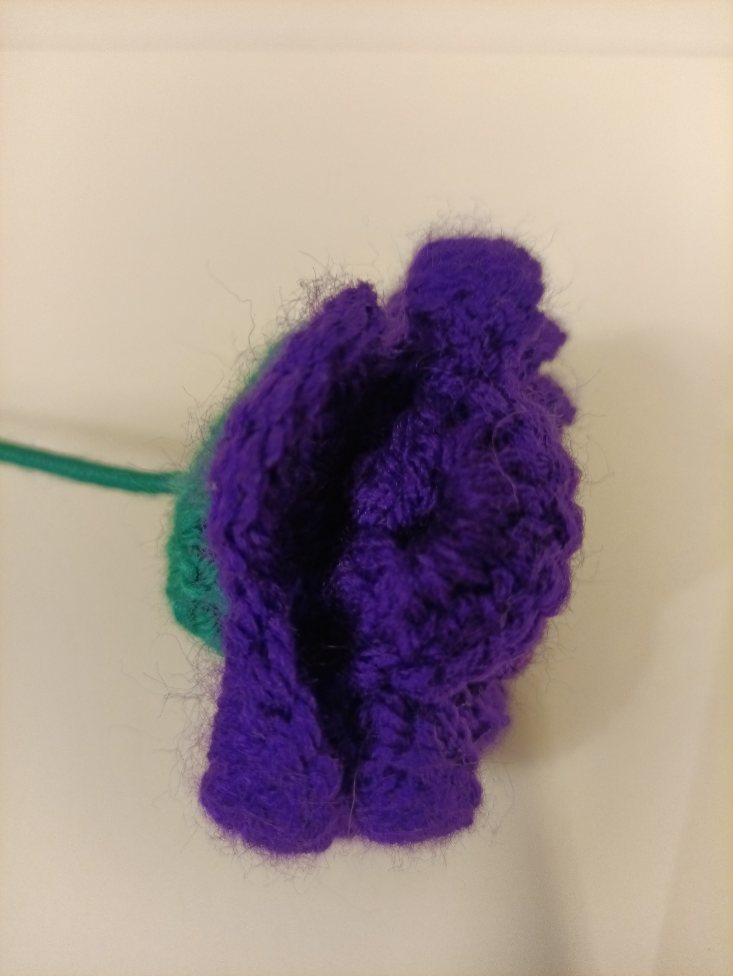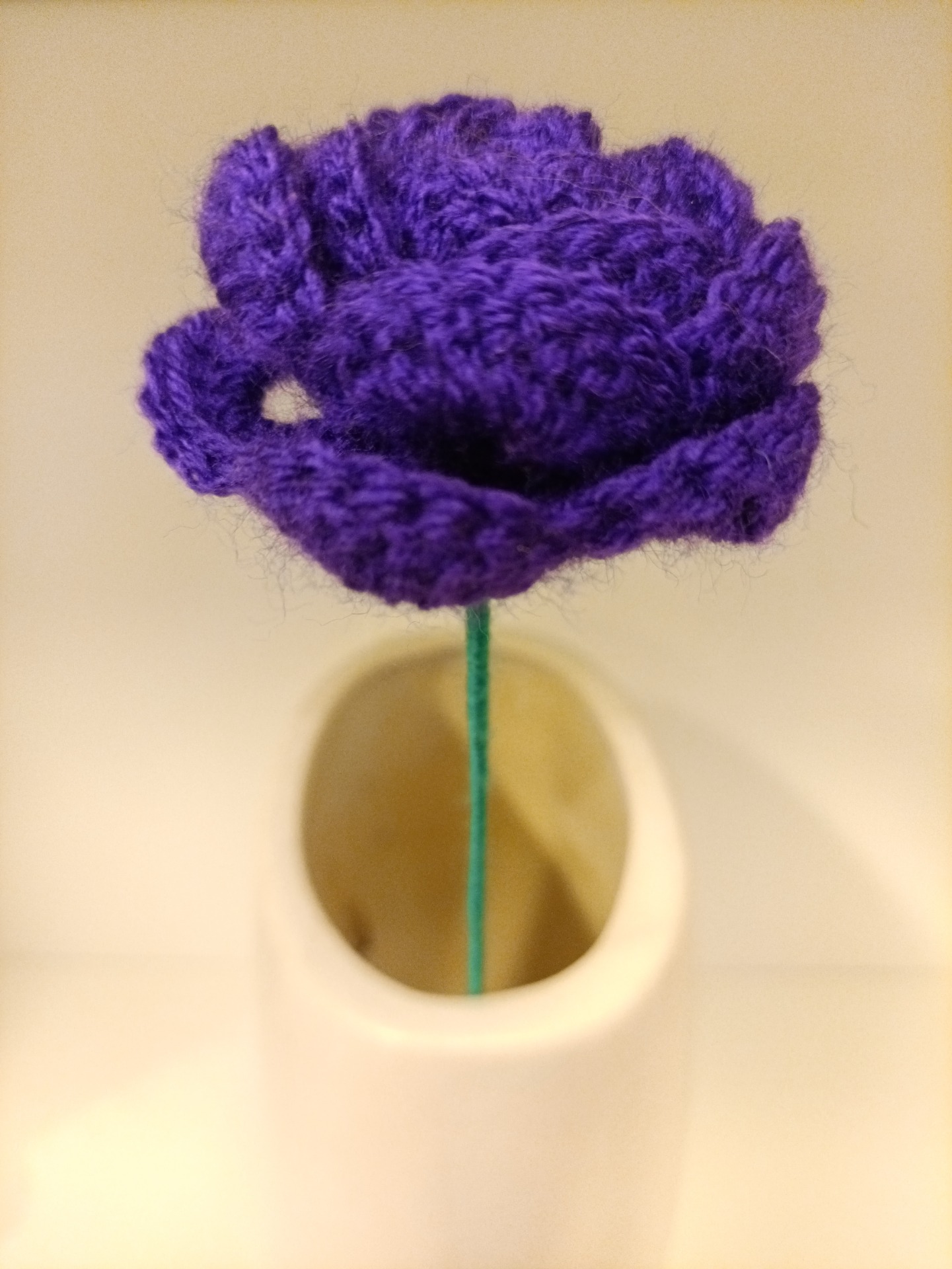 Heklet blomst med stilk i garndekket ståltråd. Stilken kan bøyes, og er omtrent 30 cm lang.