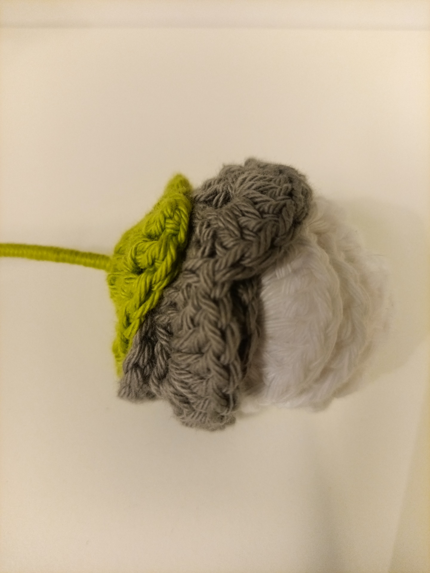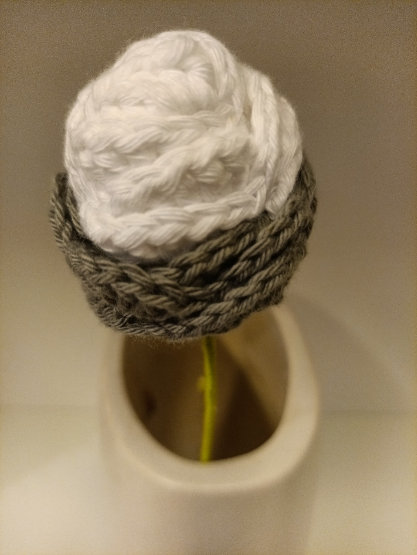 Heklet blomst med stilk i garndekket ståltråd. Stilken kan bøyes, og er omtrent 30 cm lang.