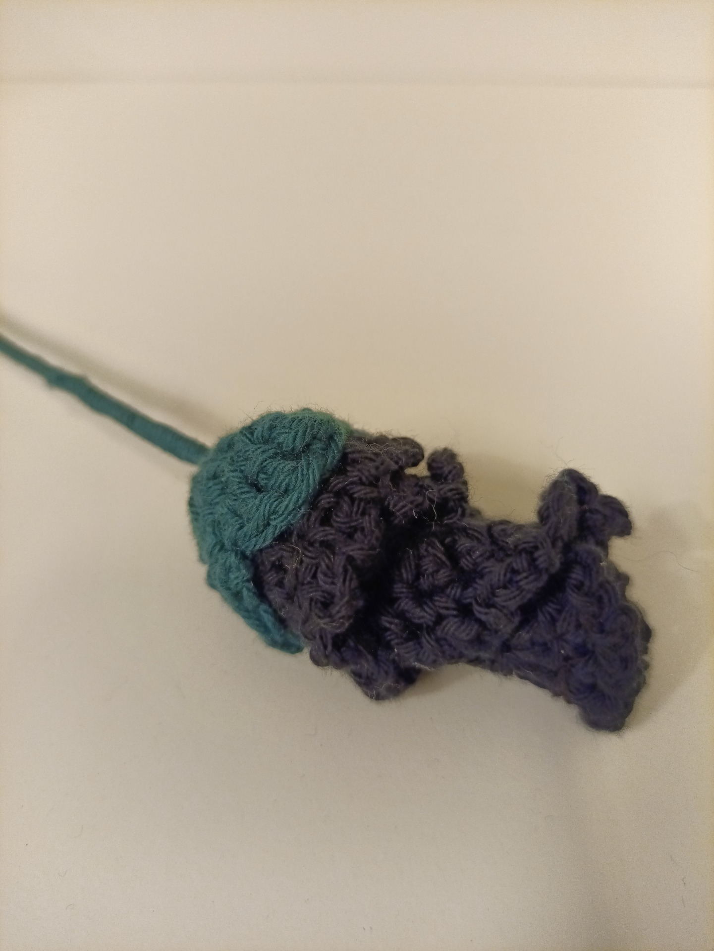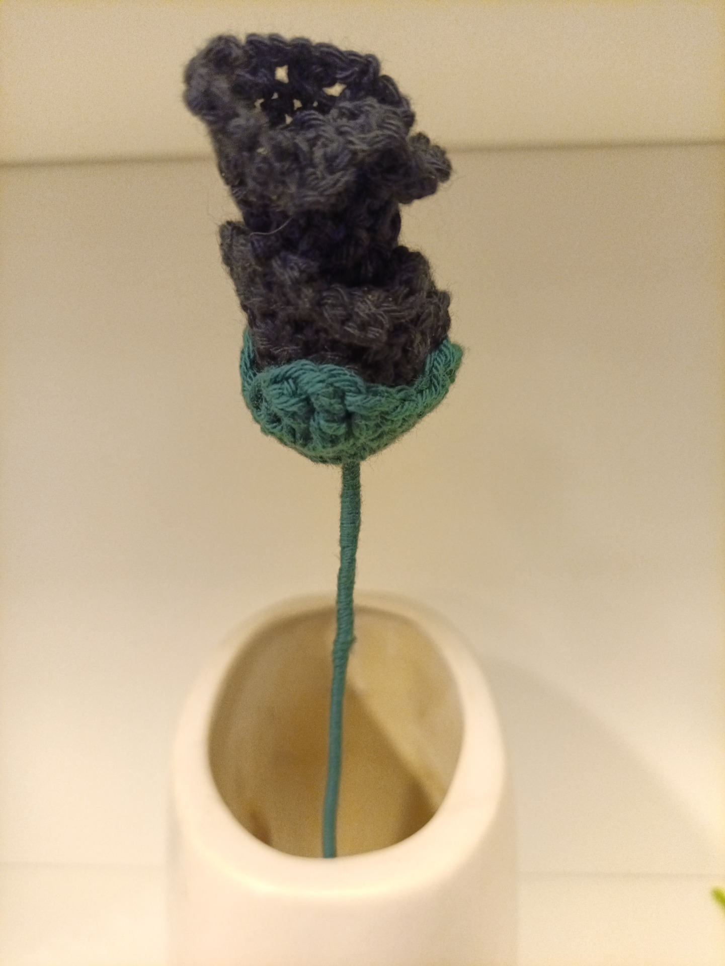 Heklet blomst med stilk i garndekket ståltråd. Stilken kan bøyes, og er omtrent 30 cm lang.