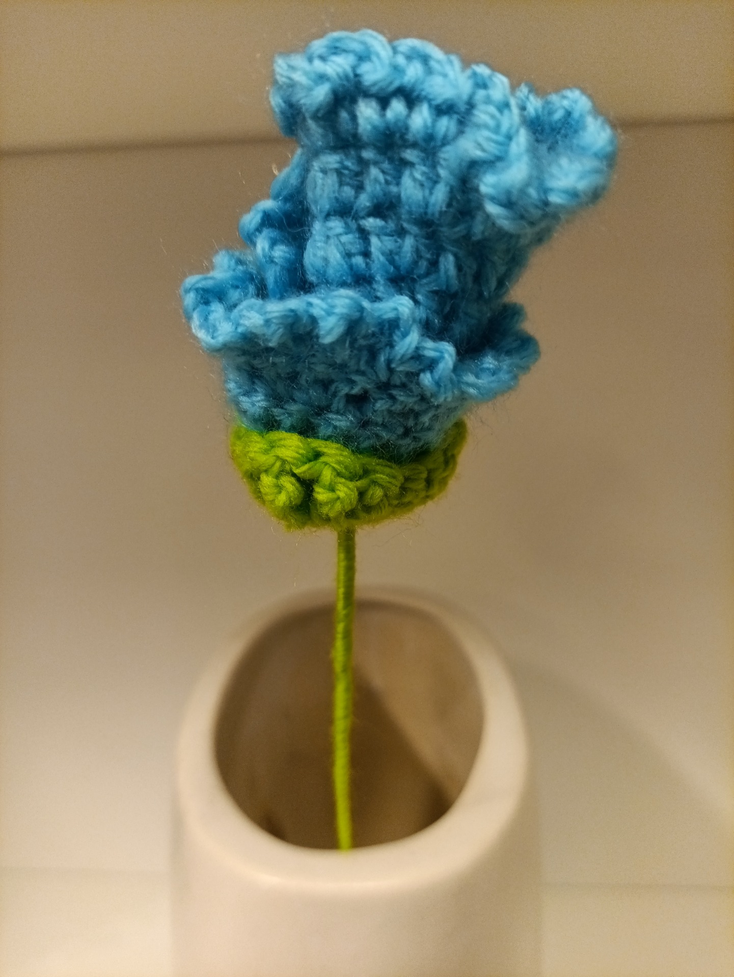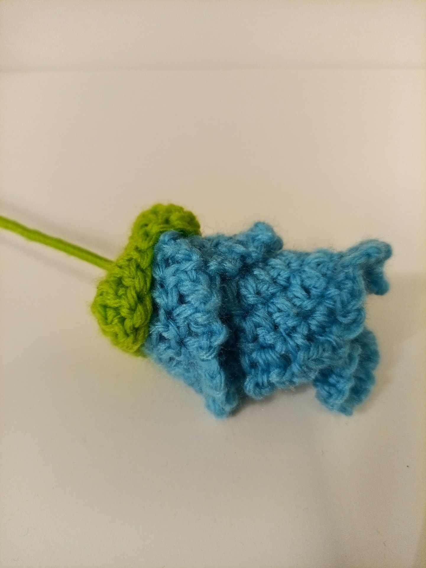 Heklet blomst med stilk i garndekket ståltråd. Stilken kan bøyes, og er omtrent 30 cm lang.