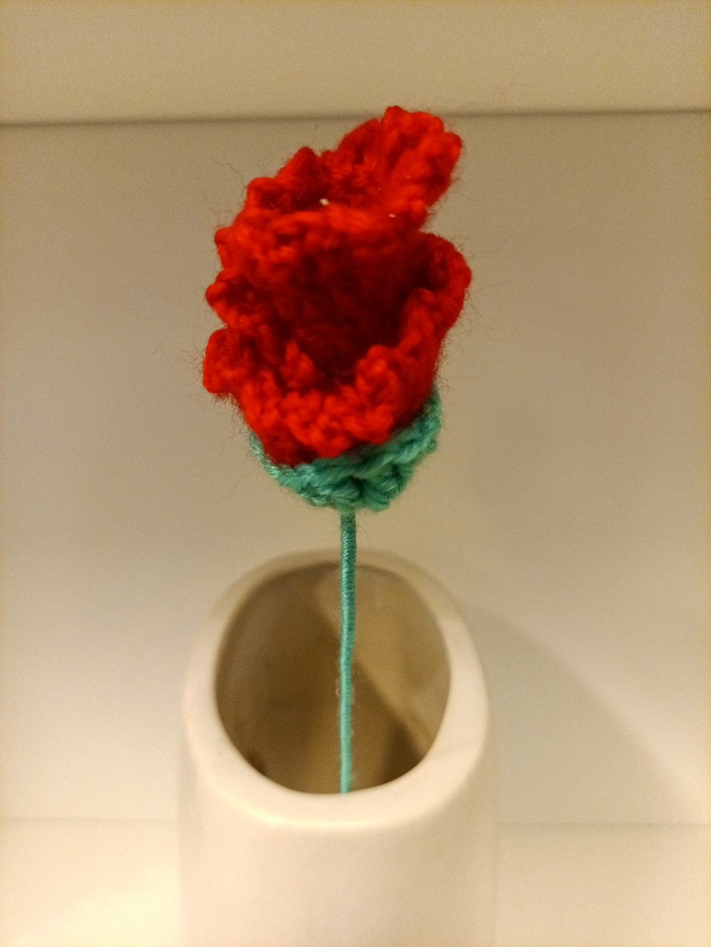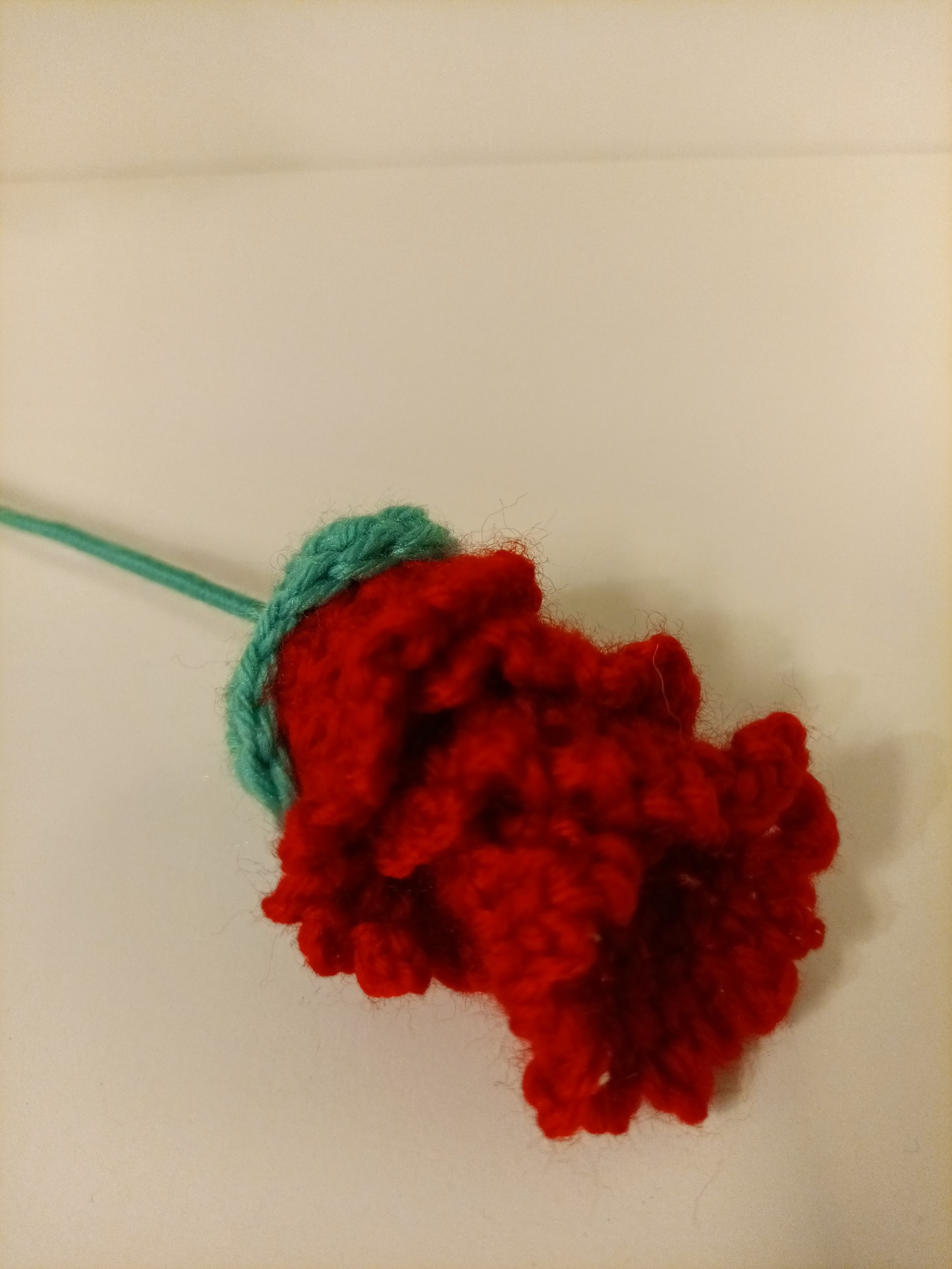 Heklet blomst med stilk i garndekket ståltråd. Stilken kan bøyes, og er omtrent 30 cm lang.