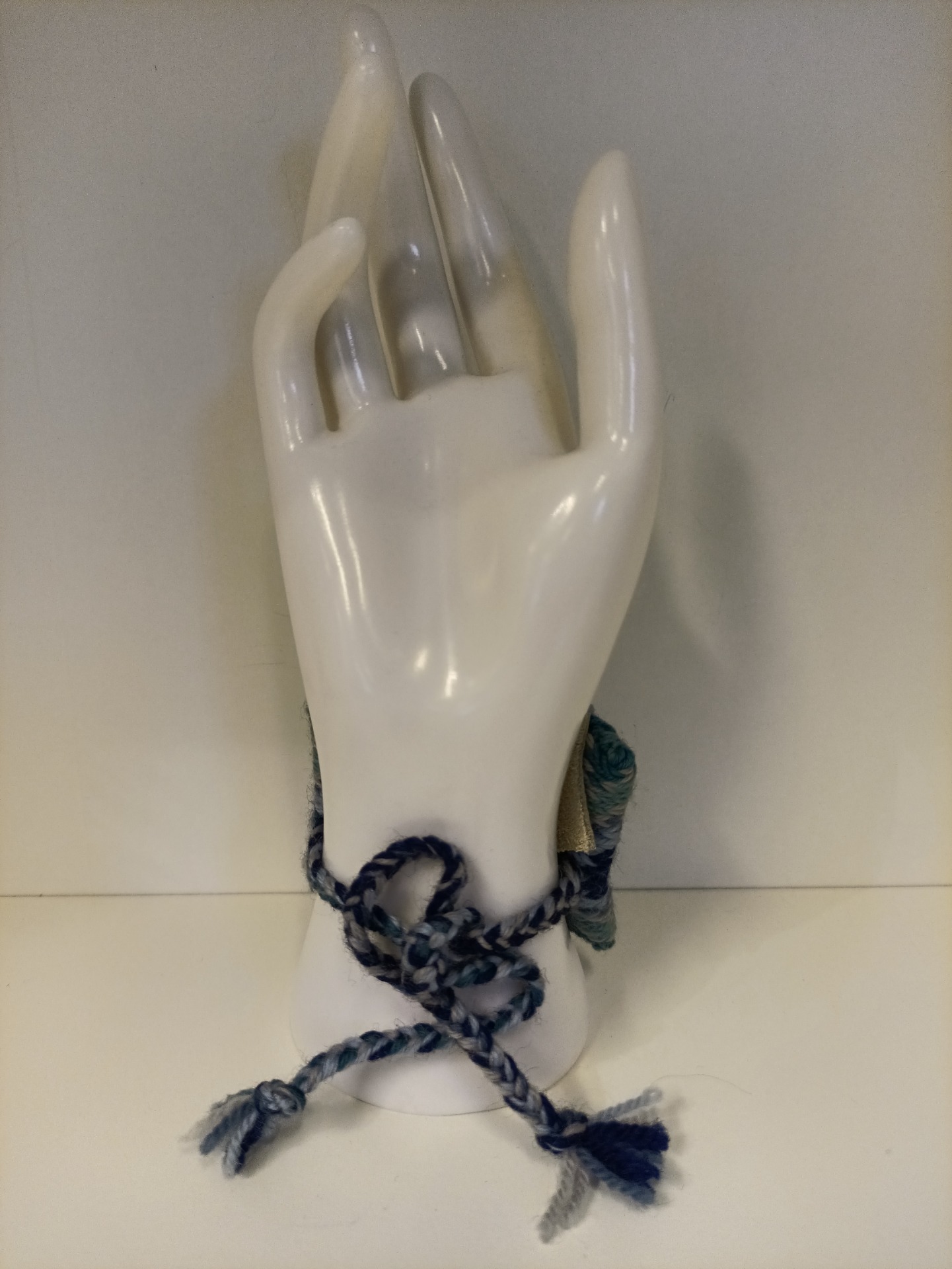Armbånd laget i ull, med brikkevevsteknikk. Brikkevev er en meget gammel veveteknikk som ble blant annet brukt av vikingene for å dekorere klærne sine, og som har fulgt oss til i dag som dekorasjon på enkelte av bunadene våres. Disse armbåndene passer fint til å pynte opp finantrekket. Akkurat denne utgaven kan brukes til historisk re-enactment, da materialet er historisk korrekt. Knytefeste med flettet tråd.