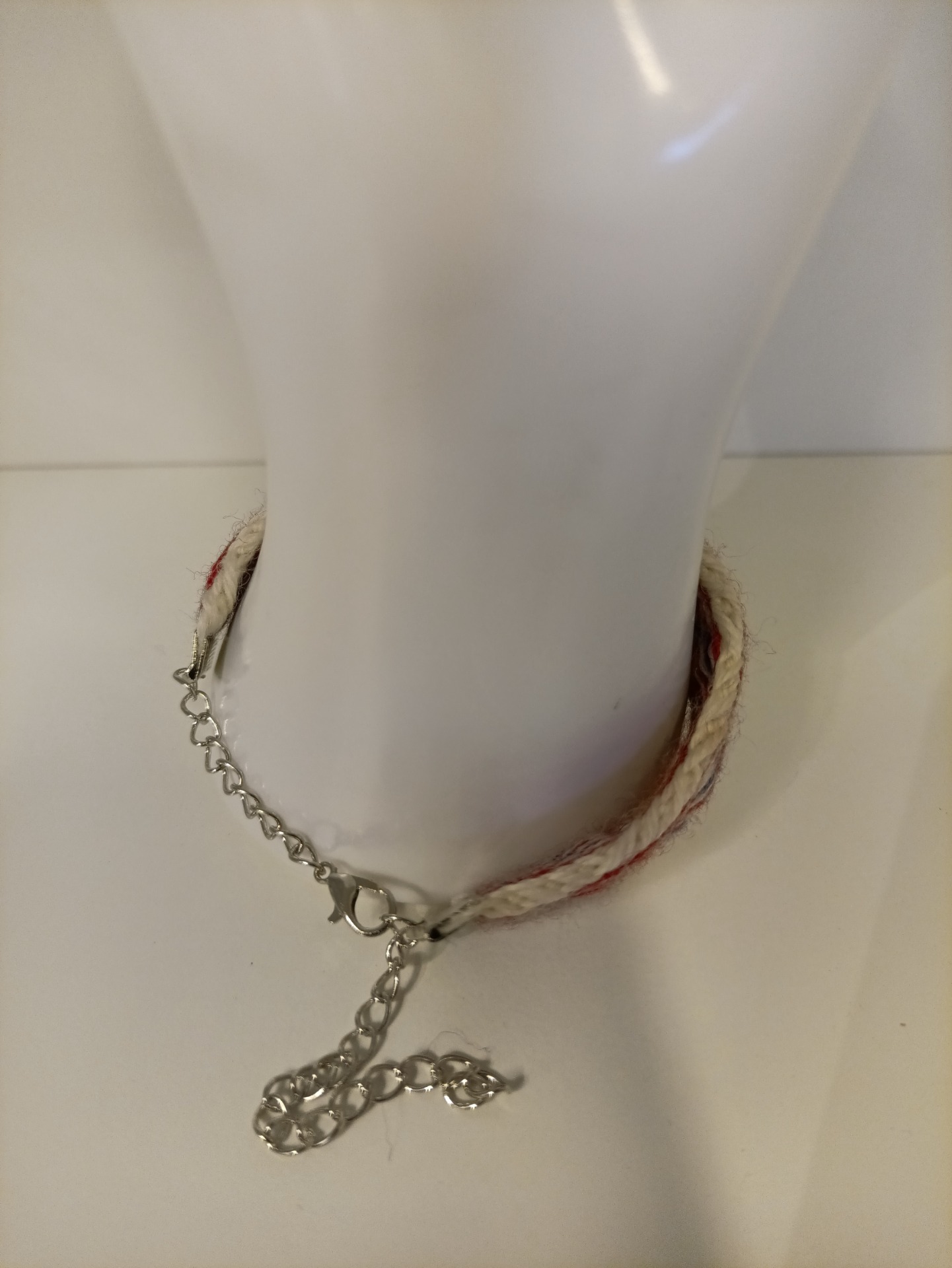 Armbånd laget i ull, med brikkevevsteknikk. Brikkevev er en meget gammel veveteknikk som ble blant annet brukt av vikingene for å dekorere klærne sine, og som har fulgt oss til i dag som dekorasjon på enkelte av bunadene våres. Disse armbåndene passer fint til å pynte opp finantrekket. Akkurat denne utgaven er i gråsonen om den kan brukes til historisk re-enactment, da materialet er historisk korrekt, men festemekanismen er ikke. Klypelås med justerbar lengde.