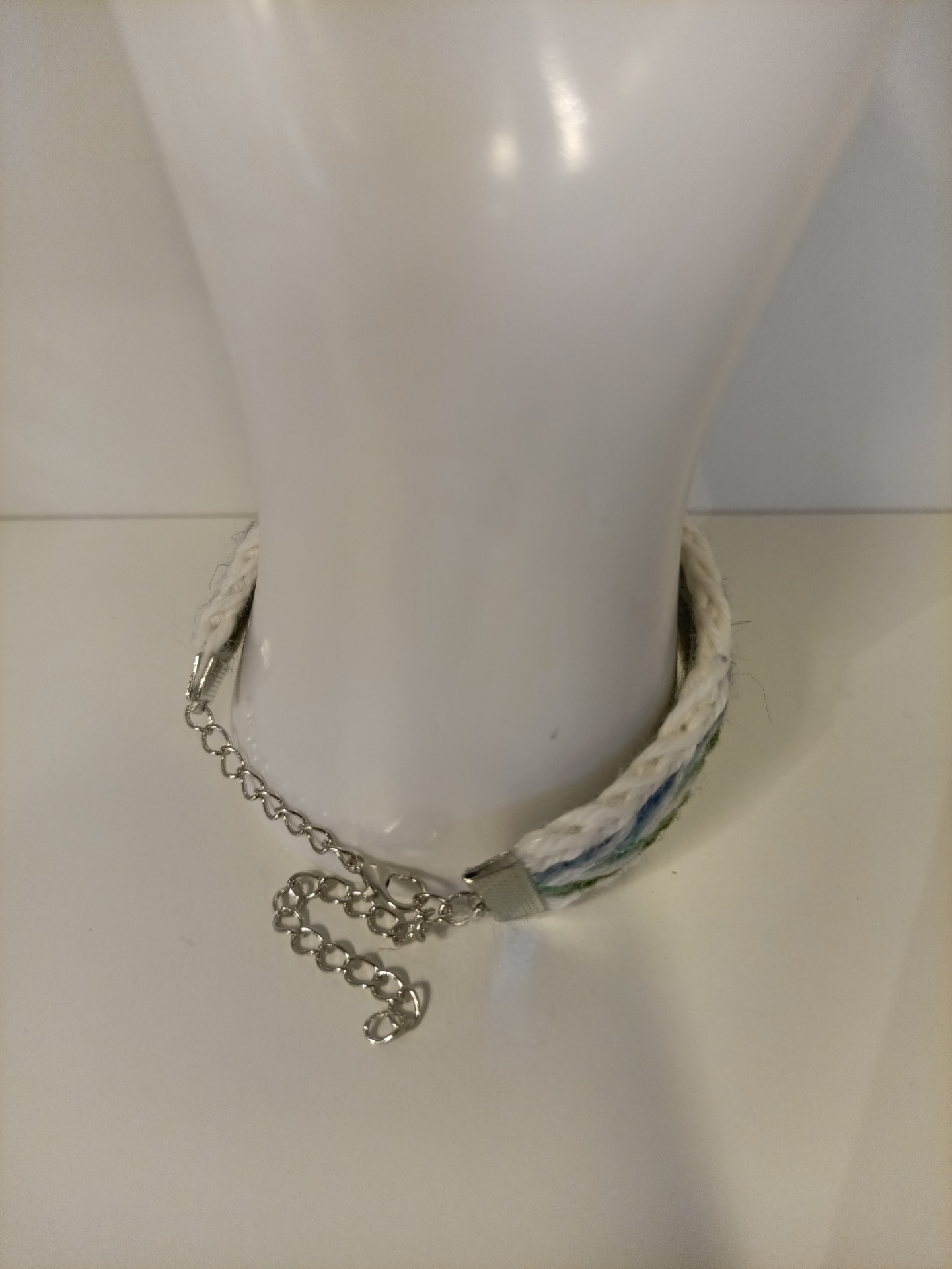 Armbånd laget i ull, med brikkevevsteknikk. Brikkevev er en meget gammel veveteknikk som ble blant annet brukt av vikingene for å dekorere klærne sine, og som har fulgt oss til i dag som dekorasjon på enkelte av bunadene våres. Disse armbåndene passer fint til å pynte opp finantrekket. Akkurat denne utgaven er i gråsonen om den kan brukes til historisk re-enactment, da materialet er historisk korrekt, men festemekanismen er ikke. Klypelås med justerbar lengde.
