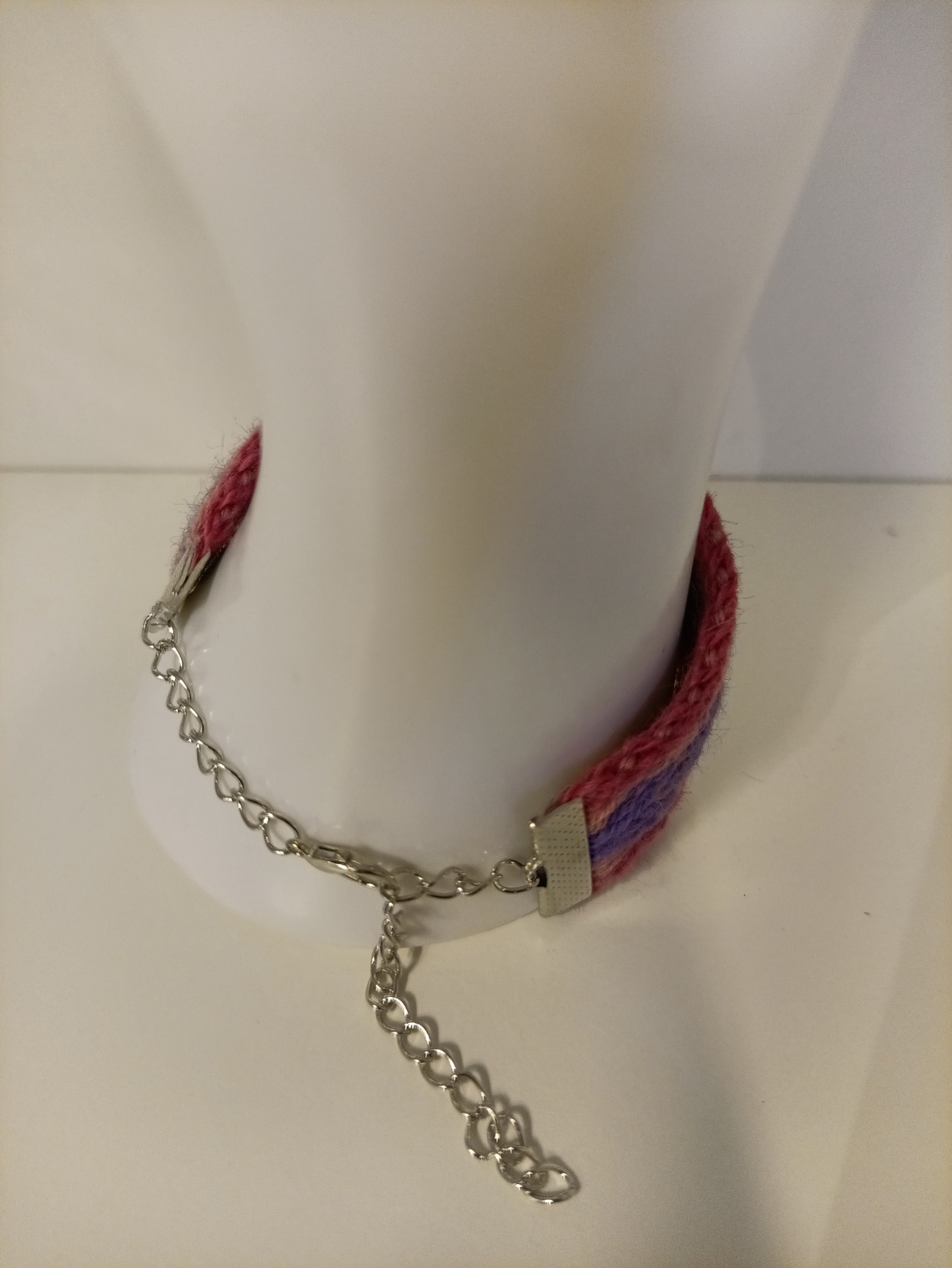 Armbånd laget i ull, med brikkevevsteknikk. Brikkevev er en meget gammel veveteknikk som ble blant annet brukt av vikingene for å dekorere klærne sine, og som har fulgt oss til i dag som dekorasjon på enkelte av bunadene våres. Disse armbåndene passer fint til å pynte opp finantrekket. Akkurat denne utgaven er i gråsonen om den kan brukes til historisk re-enactment, da materialet er historisk korrekt, men festemekanismen er ikke. Klypelås med justerbar lengde.
