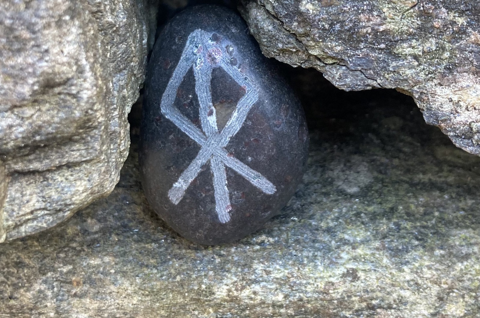 Lykkestein med binderune for "Mot". Håndgravert. Basert på historiske funn.