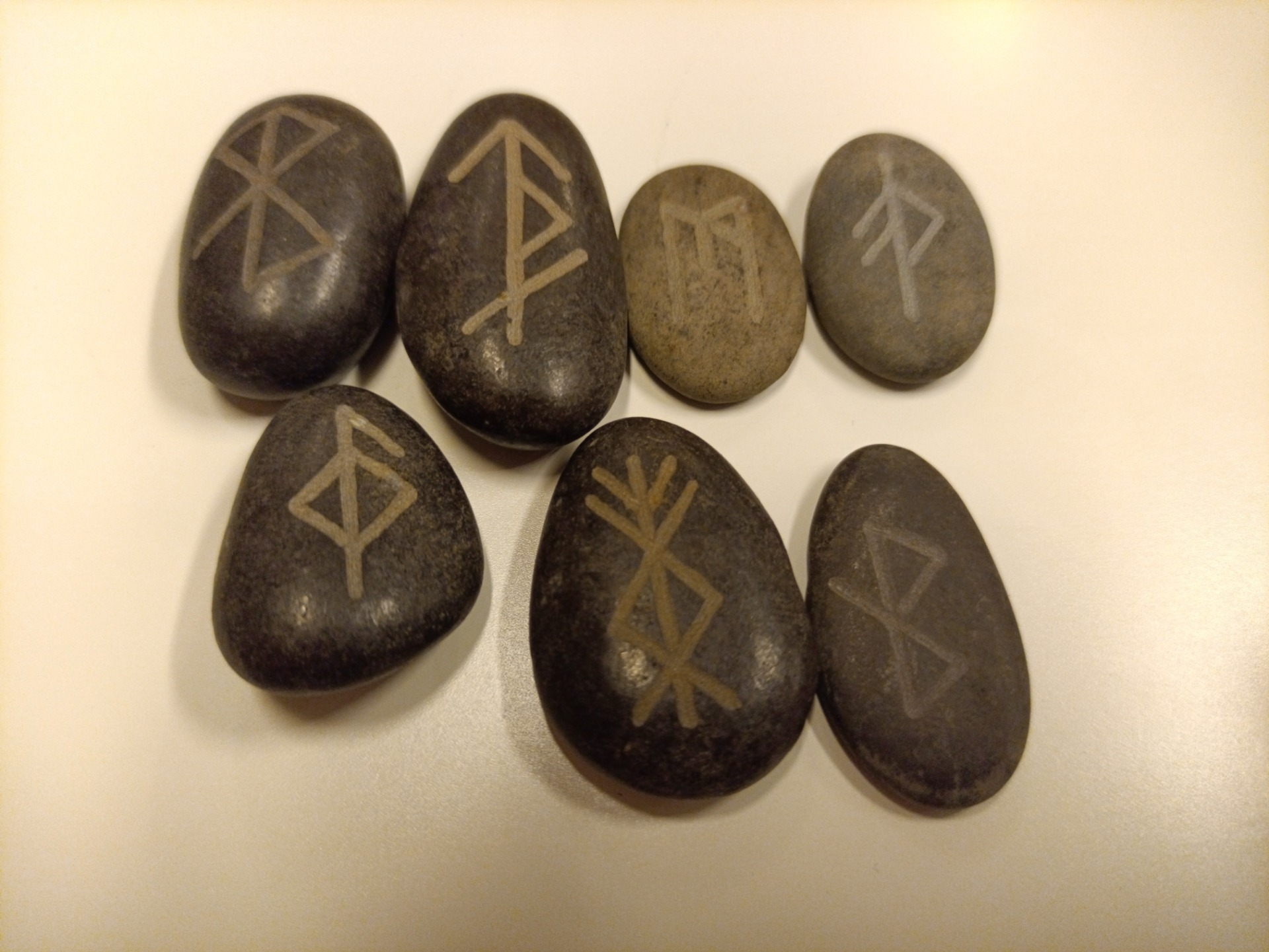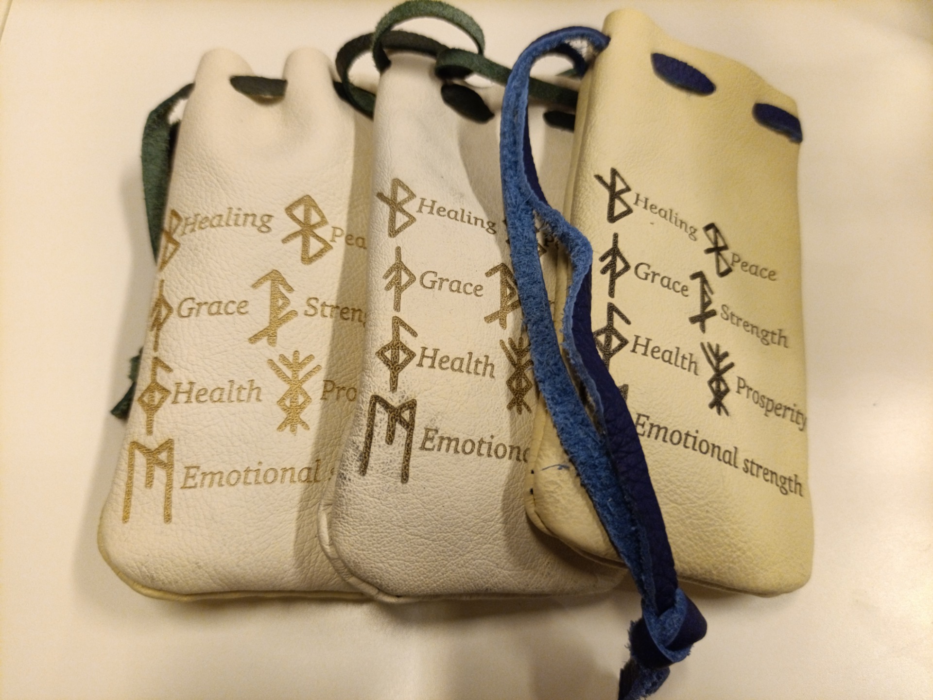 Håndsydd skinnpose med 7 graverte lykkesteiner. Oversettelse av symbolene er lasergravert på selve posen. Lykkesymbolene er basert på historiske funn.