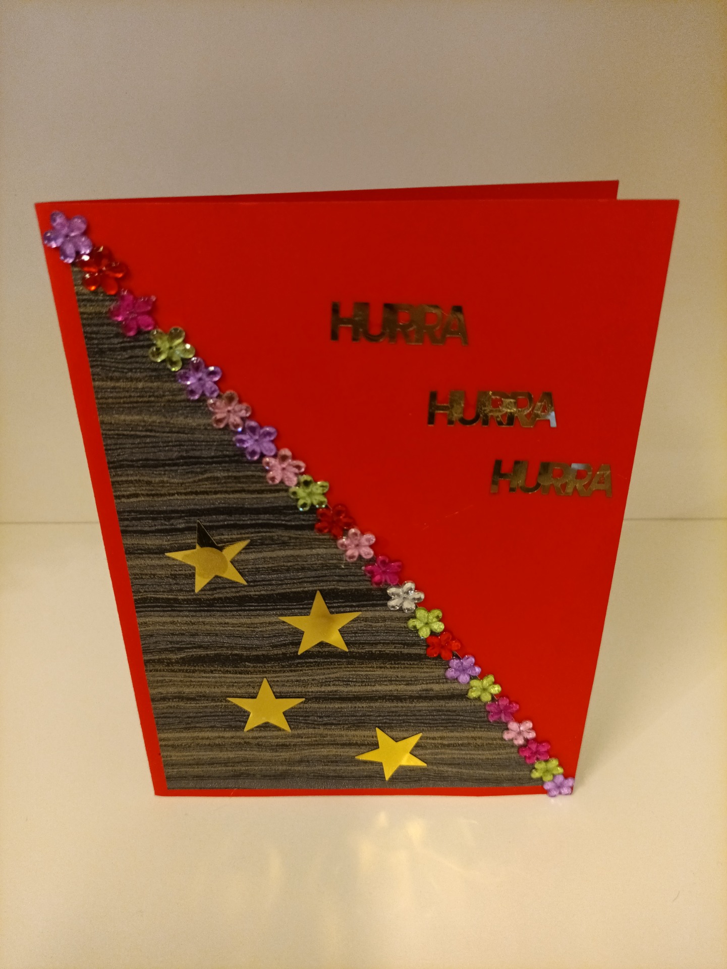 Kort, dobbel, laget av tapet-, scrapbook- og gjenbruksmateriale. 20x15 cm (A5). Konvolutt følger med.