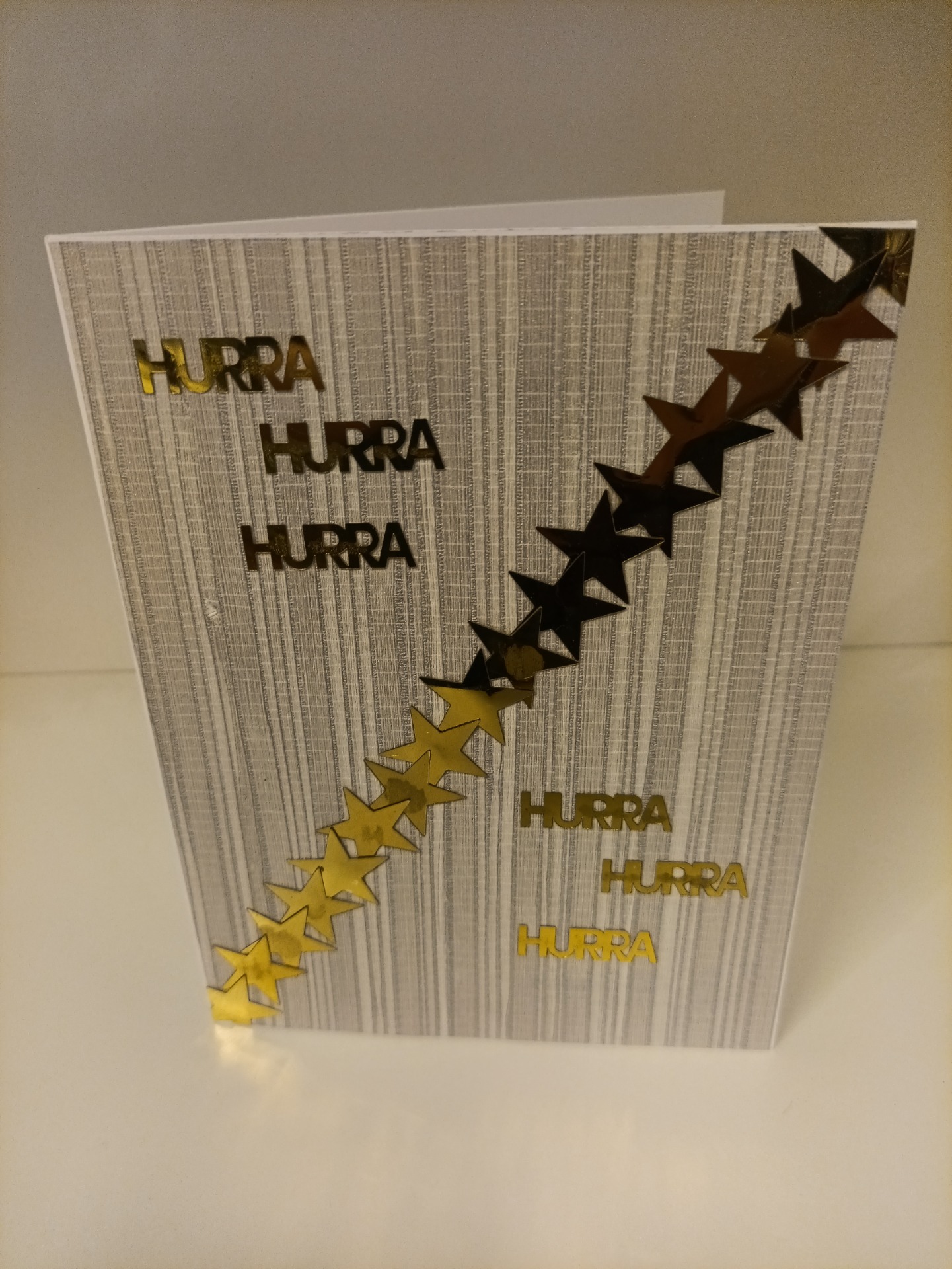 Kort, dobbel, laget av tapet-, scrapbook- og gjenbruksmateriale. 20x15 cm (A5). Konvolutt følger med.
