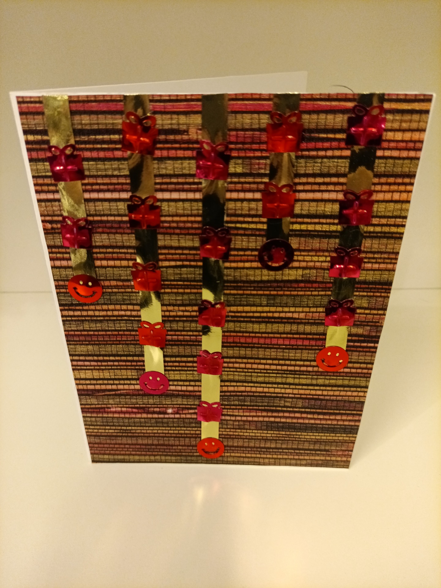 Kort, dobbel, laget av tapet-, scrapbook- og gjenbruksmateriale. 20x15 cm (A5). Konvolutt følger med.