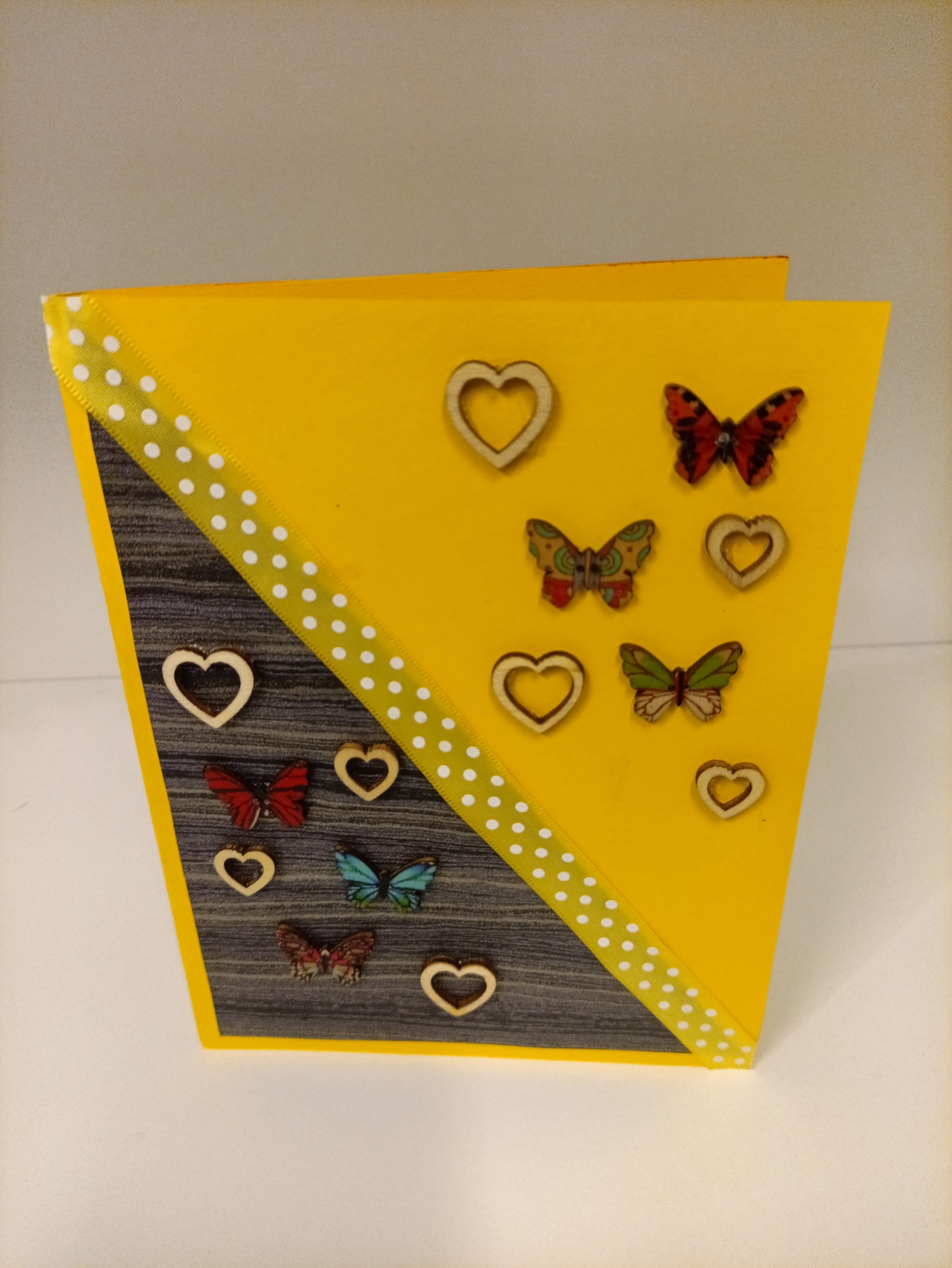 Kort, dobbel, laget av tapet-, scrapbook- og gjenbruksmateriale. 20x15 cm (A5). Konvolutt følger med.