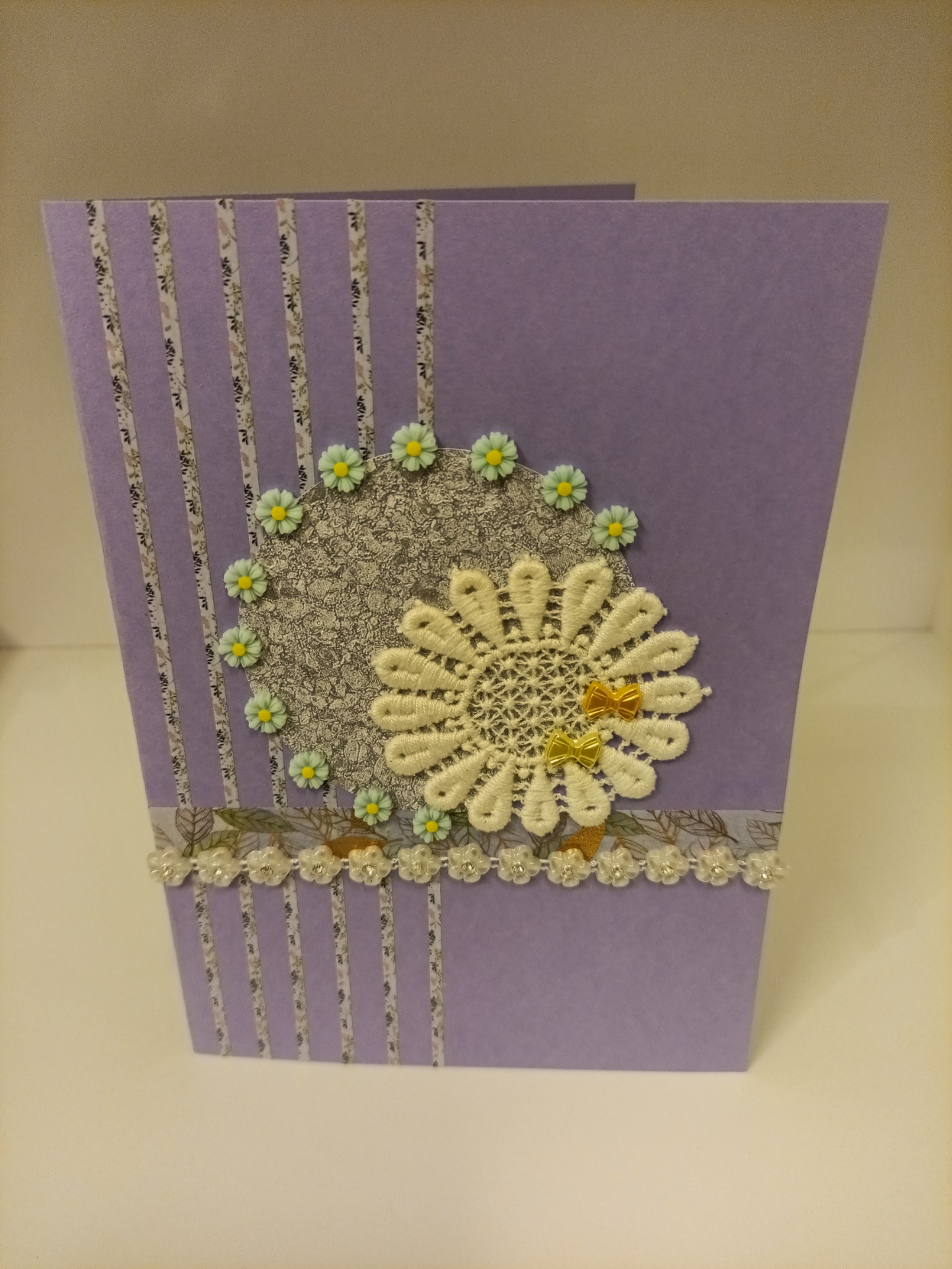 Kort, dobbel, laget av tapet-, scrapbook- og gjenbruksmateriale. 20x15 cm (A5). Konvolutt følger med.