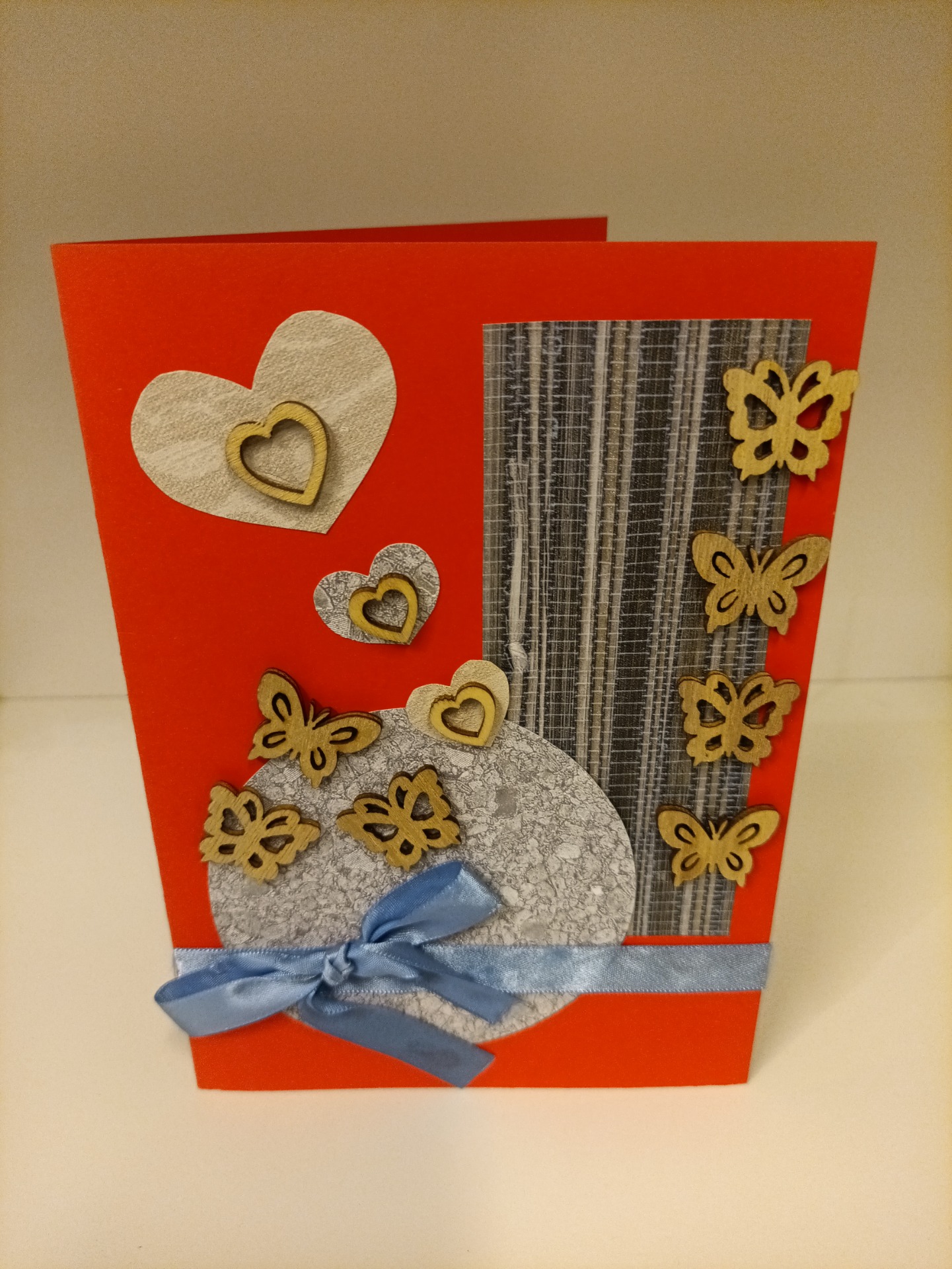 Kort, dobbel, laget av tapet-, scrapbook- og gjenbruksmateriale. 20x15 cm (A5). Konvolutt følger med.