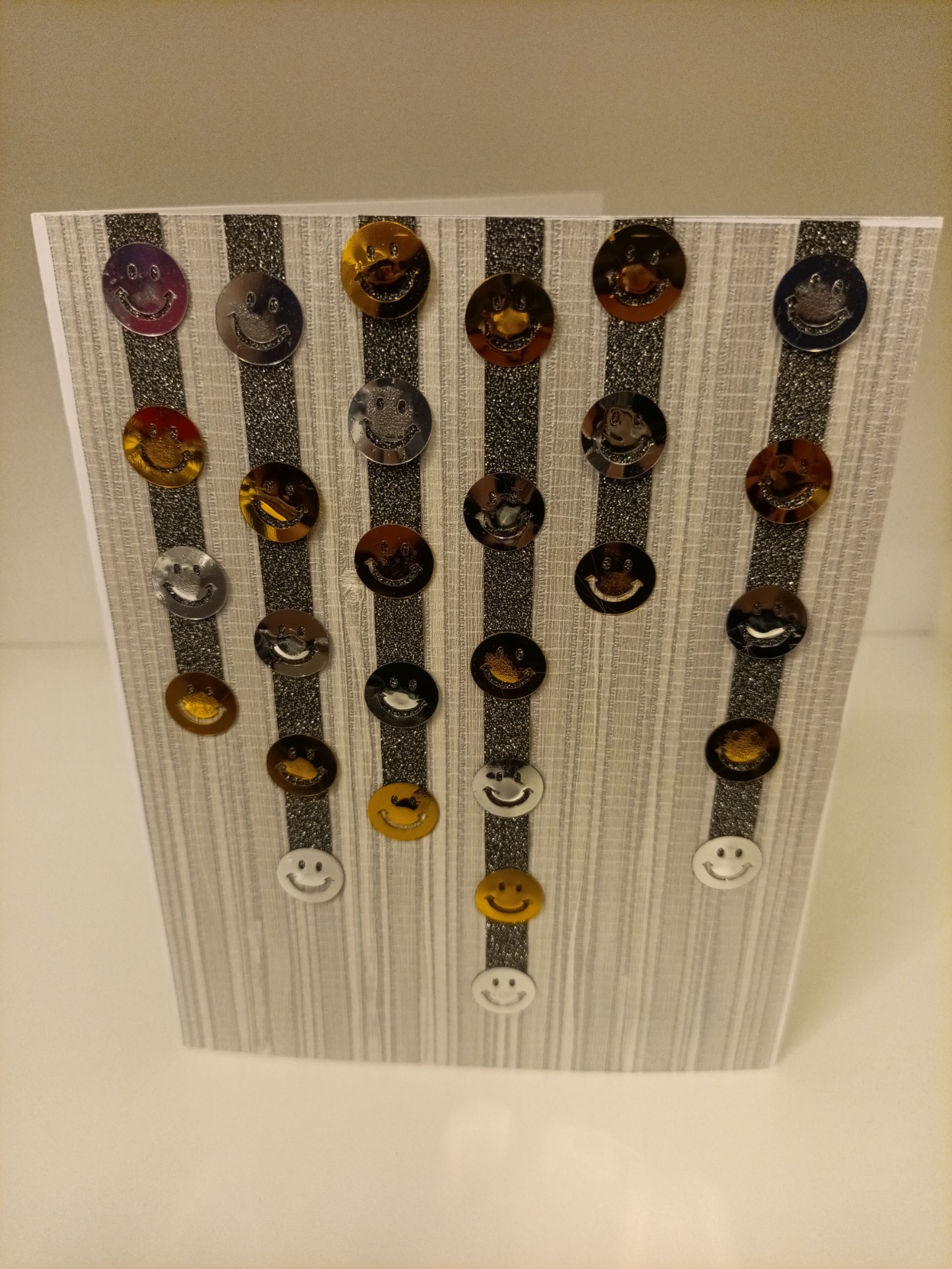 Kort, dobbel, laget av tapet-, scrapbook- og gjenbruksmateriale. 20x15 cm (A5). Konvolutt følger med.